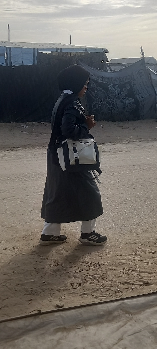 The image depicts an individual walking from left to right across an uneven dirt path in Khan Yunis, Palestinian Territory. The person wears a black hijab, a dark, long-sleeved outer garment, white pa…read more