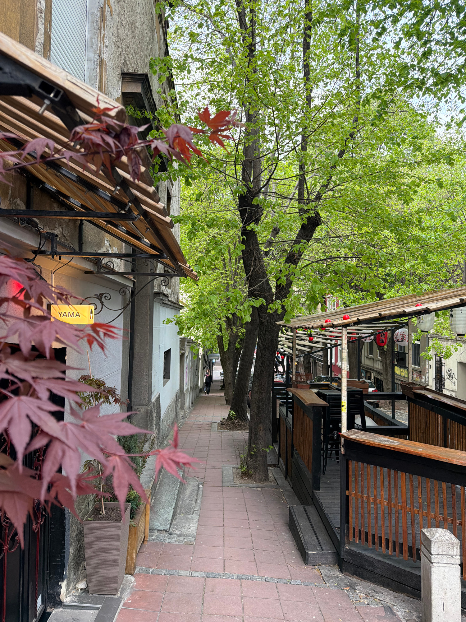 The image depicts a narrow pedestrian walkway in Belgrade, Serbia, flanked by buildings and outdoor restaurant seating. The walkway is paved with reddish-brown tiles. A large tree with green foliage a…read more