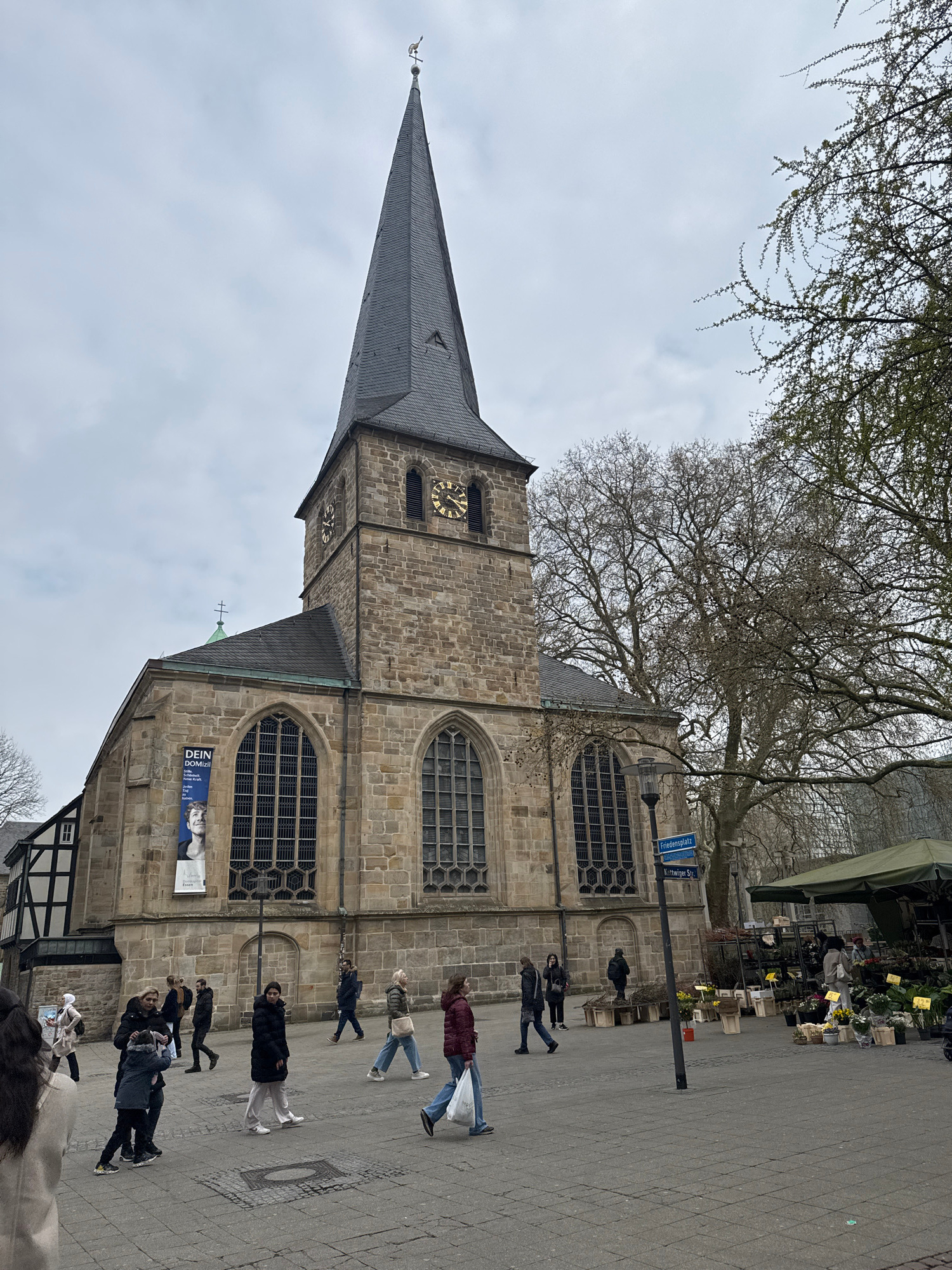 The image depicts the Markt Kirche (Market Church) in Essen, Germany. The church is constructed of light-colored stone with a tall spire. It stands beside a brick-paved pedestrian area. A number of pe…read more