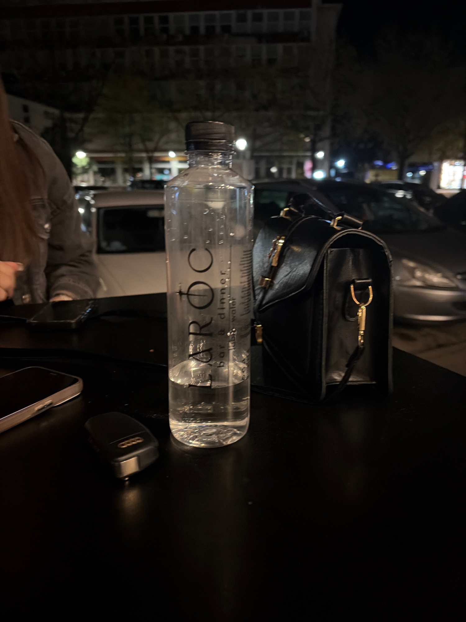 The image shows a close-up of a table surface at an outdoor location, likely a restaurant or bar. Dominating the scene is a plastic bottle of L'AROC water, partially full. Next to it is a black leathe…read more