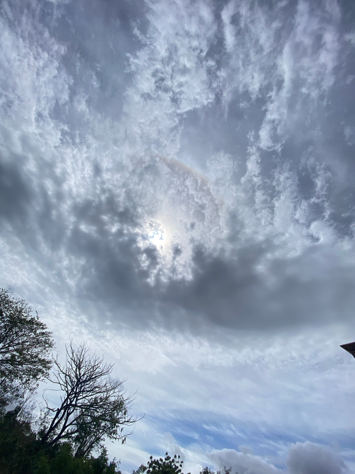 The image shows a sky heavily overcast with grey and white clouds. A partial halo or iridescence effect is visible around the sun, which is obscured by the clouds. Tree branches and foliage are visiblβ¦read more