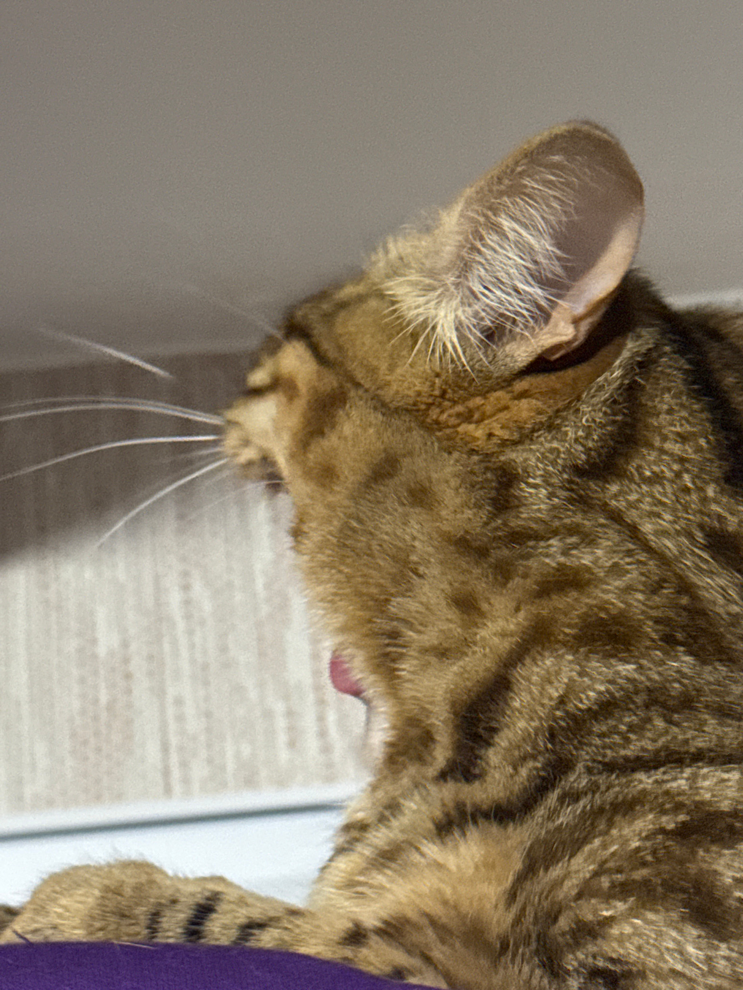 Close-up view of a brown tabby cat looking down. The cat is partially visible, with its head and part of its body in frame. It has a light brown ear, and several white whiskers visible. The background…read more