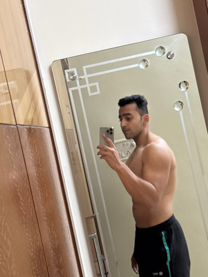 A shirtless man in black athletic shorts takes a mirror selfie with an iPhone. He has dark hair and is positioned at an angle, showing off his physique. The mirror is decorated with small, rounded gla…read more