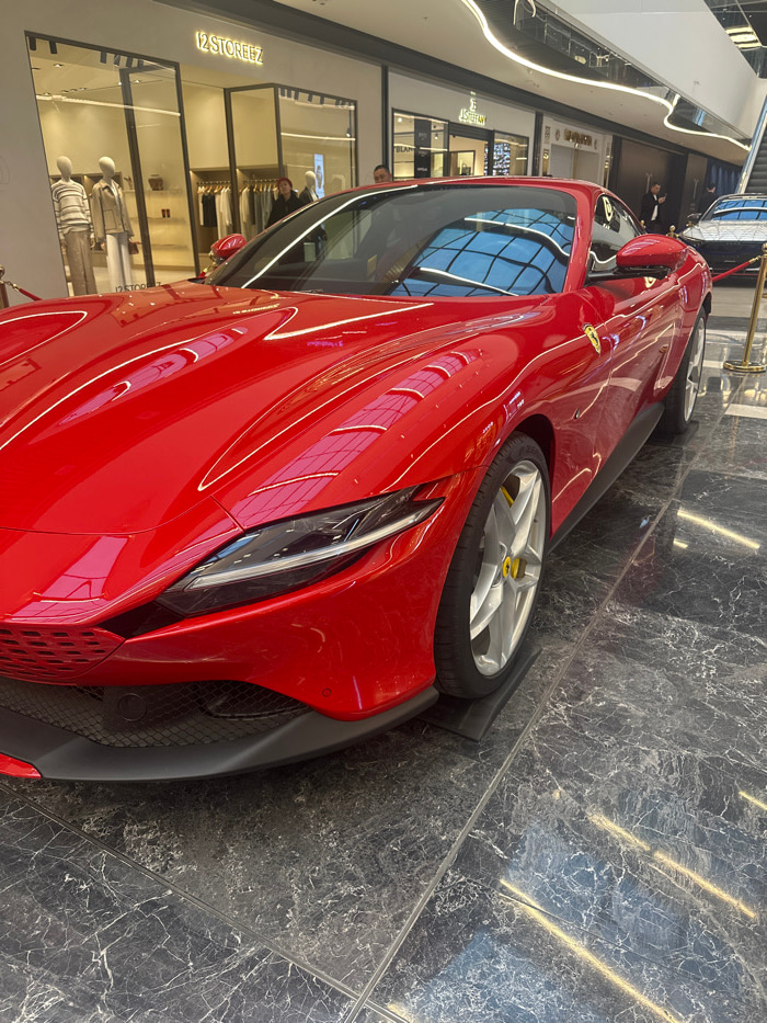 The image displays a high-end modern shopping mall interior, identified as likely the Tashkent City Mall in Tashkent, Uzbekistan. A bright red Ferrari sports car, a two-door model resembling a Roma, i…read more
