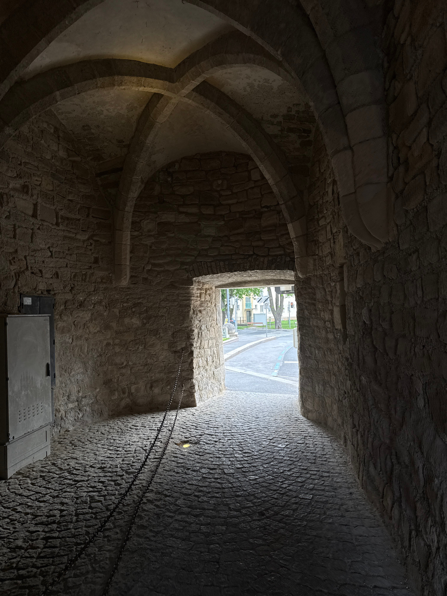 This image depicts the interior of a dark, stone-built passage or tunnel, looking out towards a brightly lit street scene. The structure, likely an ancient underpass or part of a fortification in Hainβ¦read more