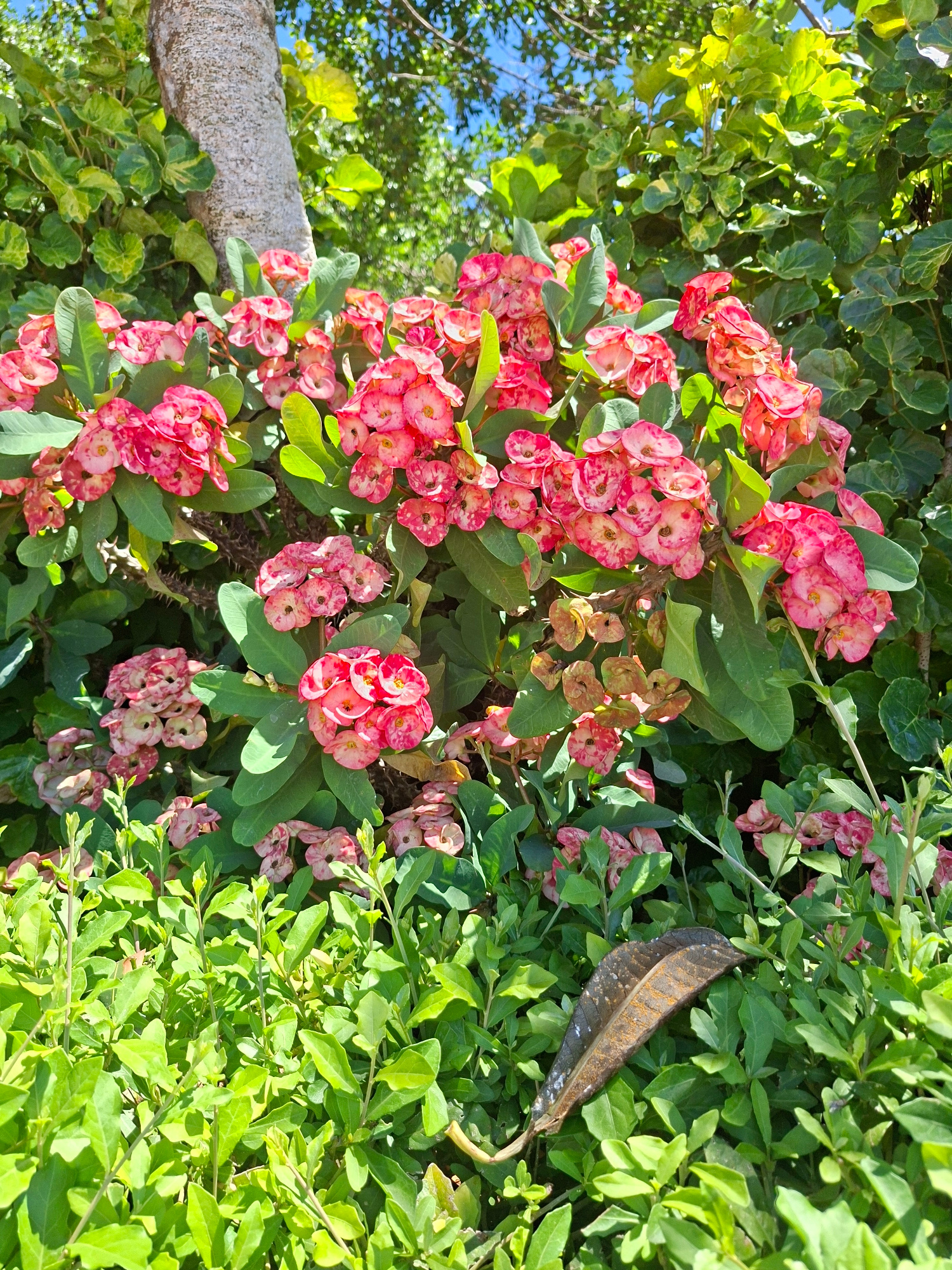 The image shows a vibrant close-up of a Crown of Thorns plant, with clusters of small, pink and red flowers surrounded by bright green leaves. The plant is densely packed and appears to be part of a l…read more