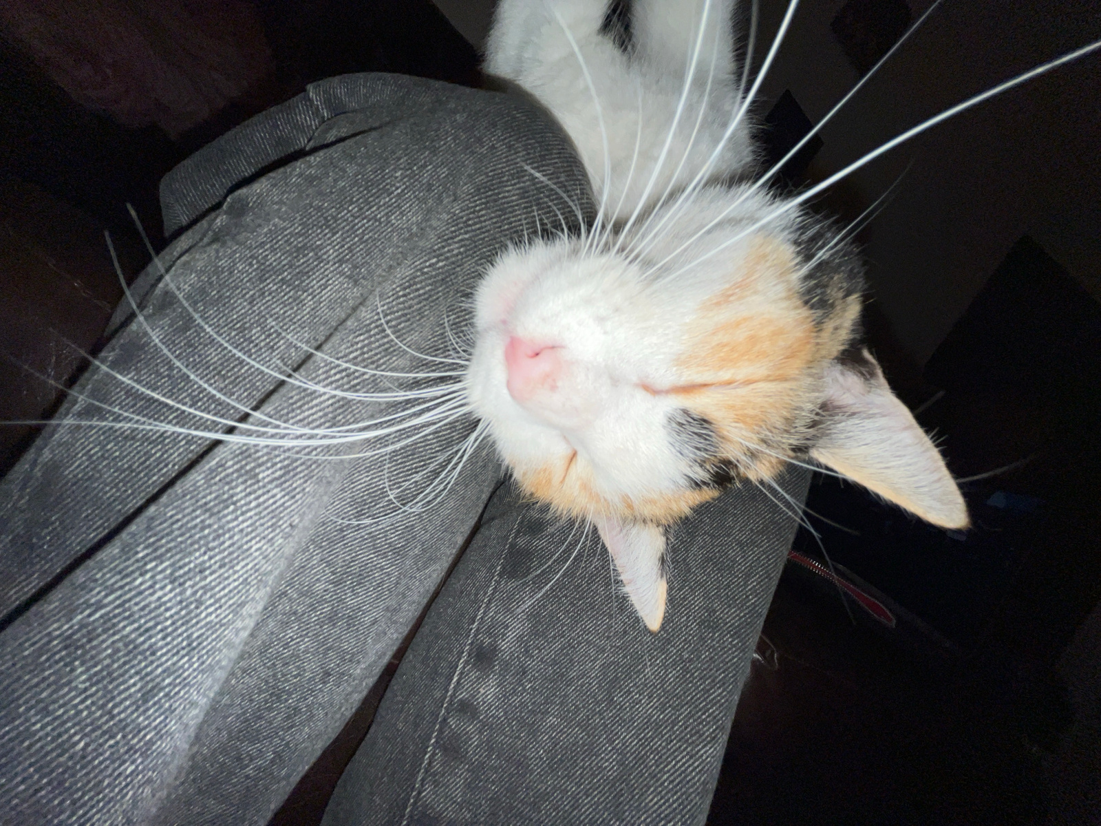 A calico cat rests its head on a pair of gray jeans. The cat's eyes are closed, and its whiskers are prominent. The background is dark and indistinct. The location in the city of Bahía Blanca, Argenti…read more