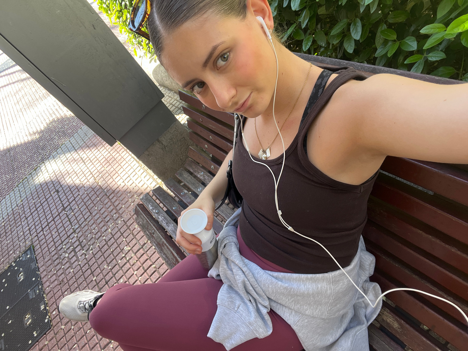 A young woman is sitting on a park bench. She has her hair pulled back, is wearing a brown tank top and maroon leggings, and has a grey sweatshirt draped around her waist. She has earbuds in, and a ne…read more