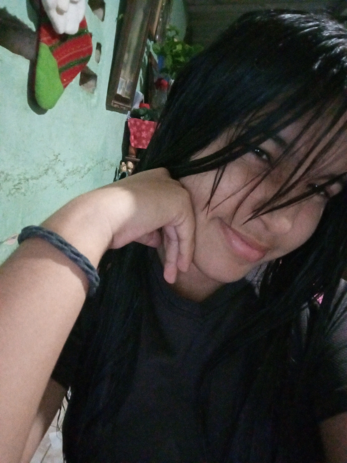 A young woman with dark, wet hair covering part of her face rests her chin on her hand. She wears a dark t-shirt and a dark-colored bracelet is visible on her wrist. A smile is visible on her face as she appears to be looking at the camera. In the background, there is a light green wall, some decorations including what seems to be a Christmas stocking, a picture frame and a plant. | Open Wire