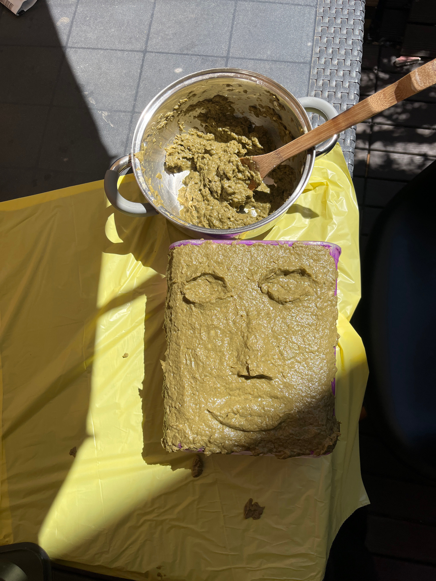 An overhead shot captures an outdoor scene featuring a pot containing a thick, greenish-brown paste, stirred with a wooden spoon. Adjacent to the pot, a rectangular container or mold is filled with thβ¦read more