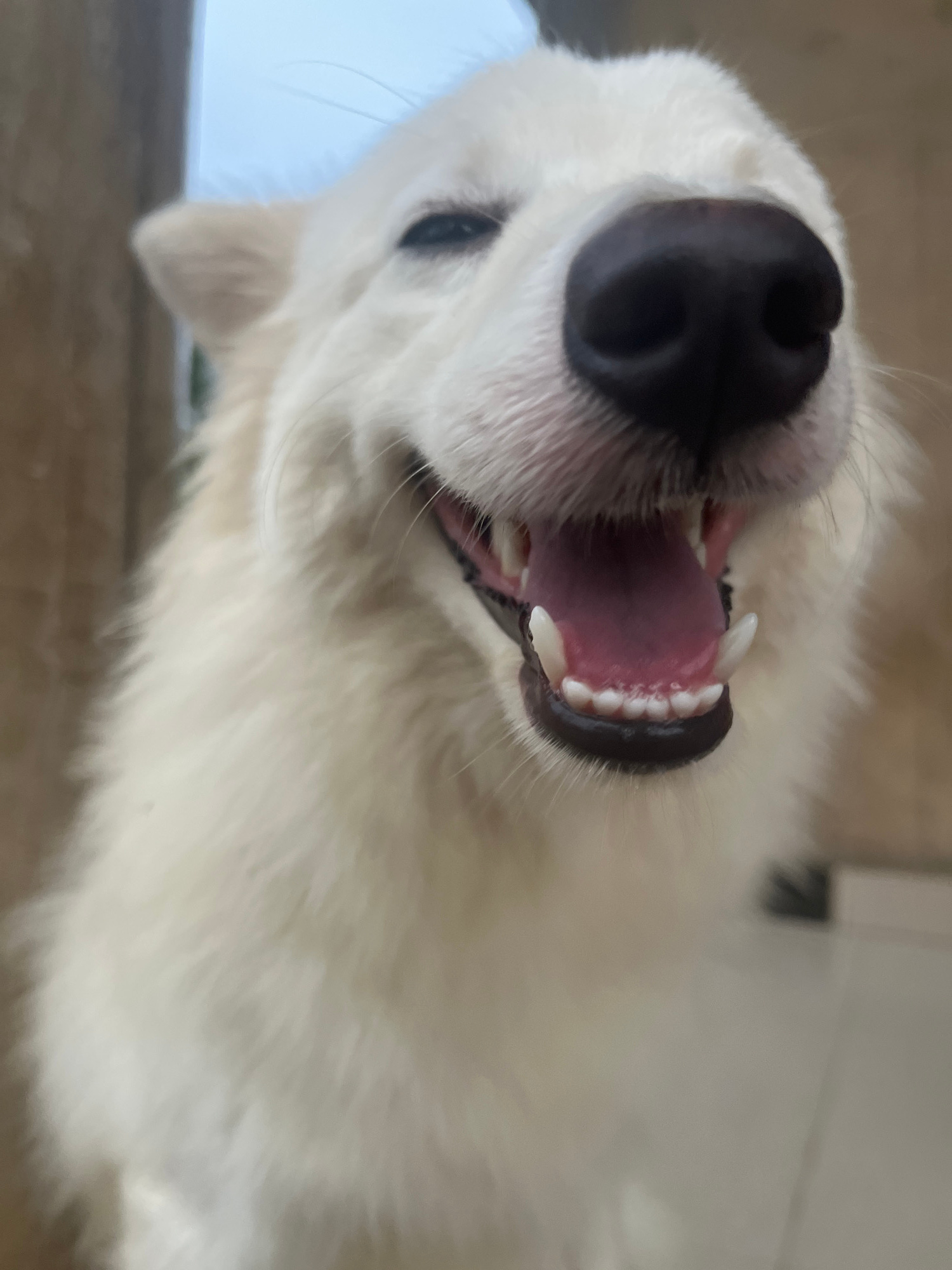 The image is an upside-down, close-up view of a white dog's face. The dog has a large, black nose, and its mouth is open, revealing pink gums and white teeth. A small portion of the dog's left eye is…read more