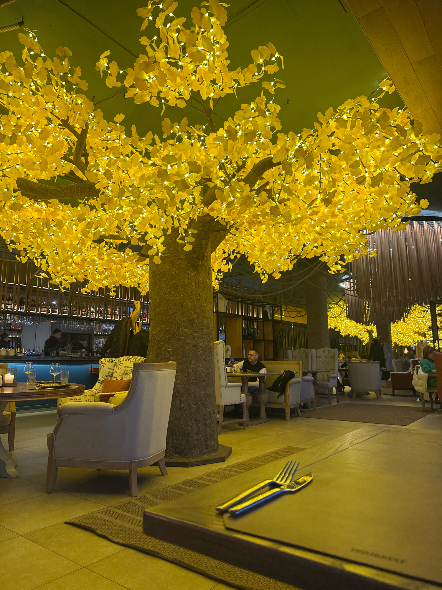The image depicts an indoor scene, seemingly within a restaurant or lounge in Unknown, Ukraine, characterized by distinctive decor. A large artificial tree, adorned with vibrant yellow leaves and illu…read more