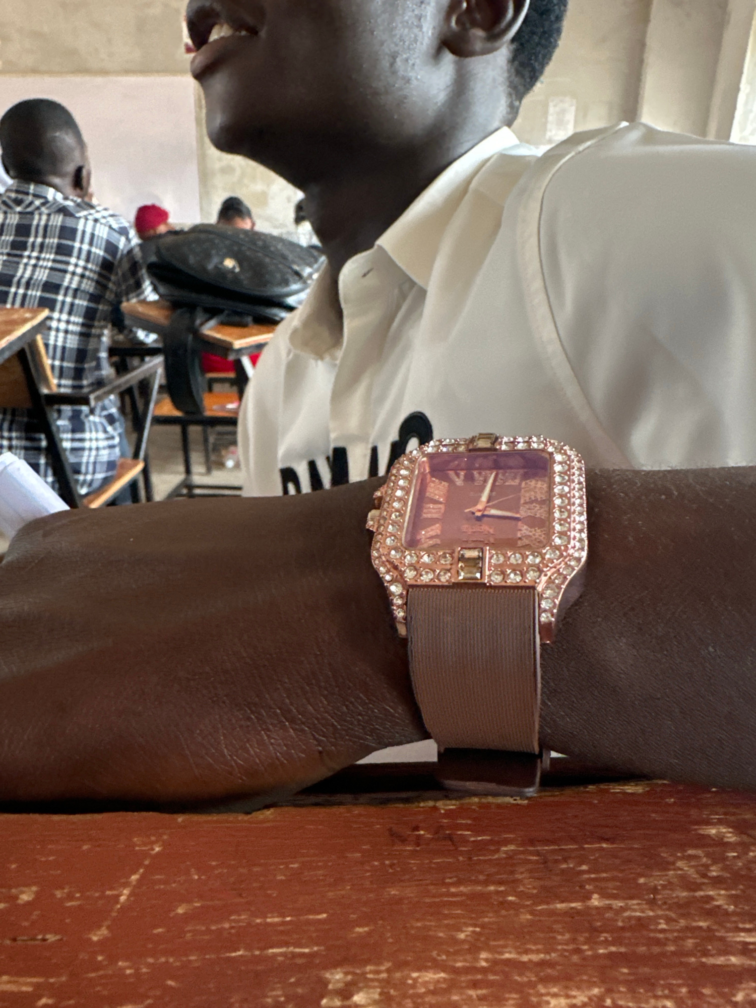 A medium shot depicts a person's arm wearing a rose gold-toned watch with a brown strap. The watch face is adorned with rhinestones. The person is wearing a white shirt. A second person wearing a plai…read more
