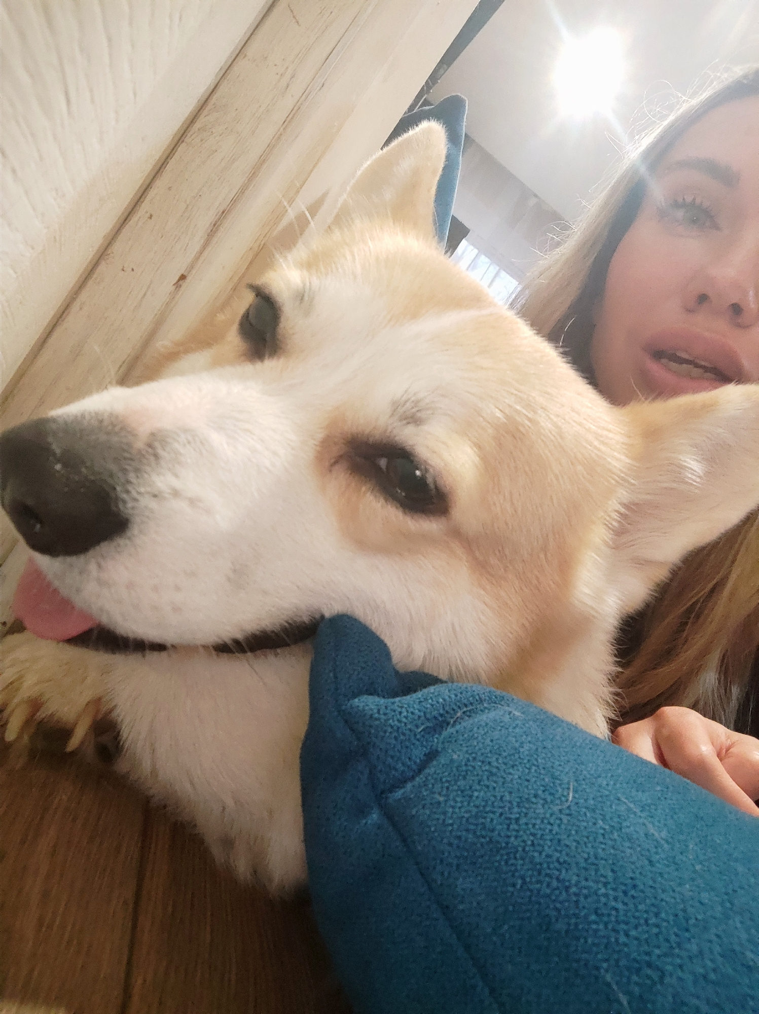 A fair-skinned woman with blonde hair is holding a white and tan corgi dog in her arms. The dog's black nose is prominent in the foreground, and its pink tongue is slightly visible. The woman's face,…read more