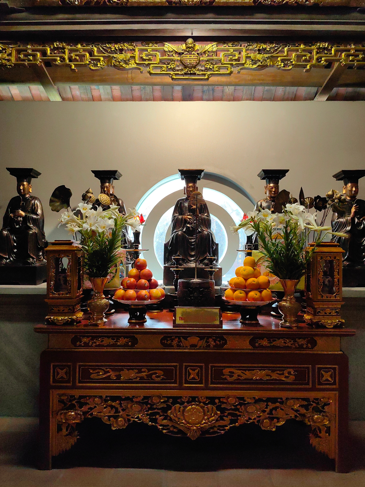 In Hong Gai Ward, Vietnam, an altar is positioned in front of a circular window. Statues of seated figures wearing rectangular hats sit on a shelf behind the altar. The altar is adorned with two pyram…read more