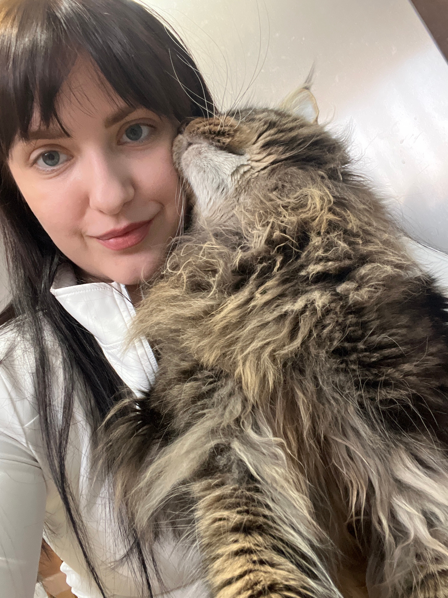 The image displays a close-up, high-angle view of a woman and a large, long-haired cat, appearing to rest together. The photograph is oriented sideways, with the subjects spanning horizontally across…read more
