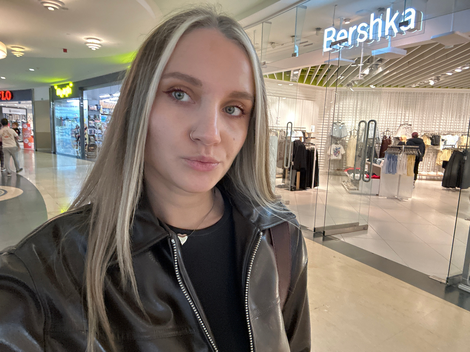 The image is taken from a high vantage point, likely overlooking the interior of a commercial establishment. A woman with light hair and wearing a black leather jacket is prominently featured in the fβ¦read more