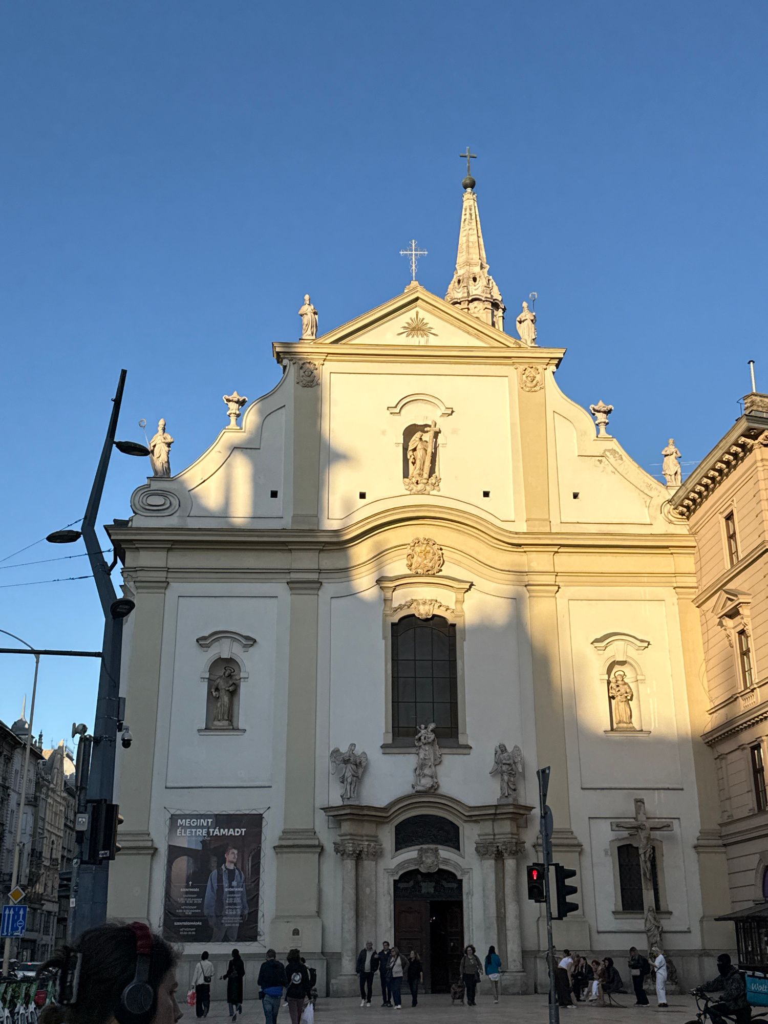 The image depicts the facade of the Inner City Franciscan Church in Budapest, Hungary. The church is white with ornate Baroque detailing, including statues, carvings, and a spire topped with a cross.…read more