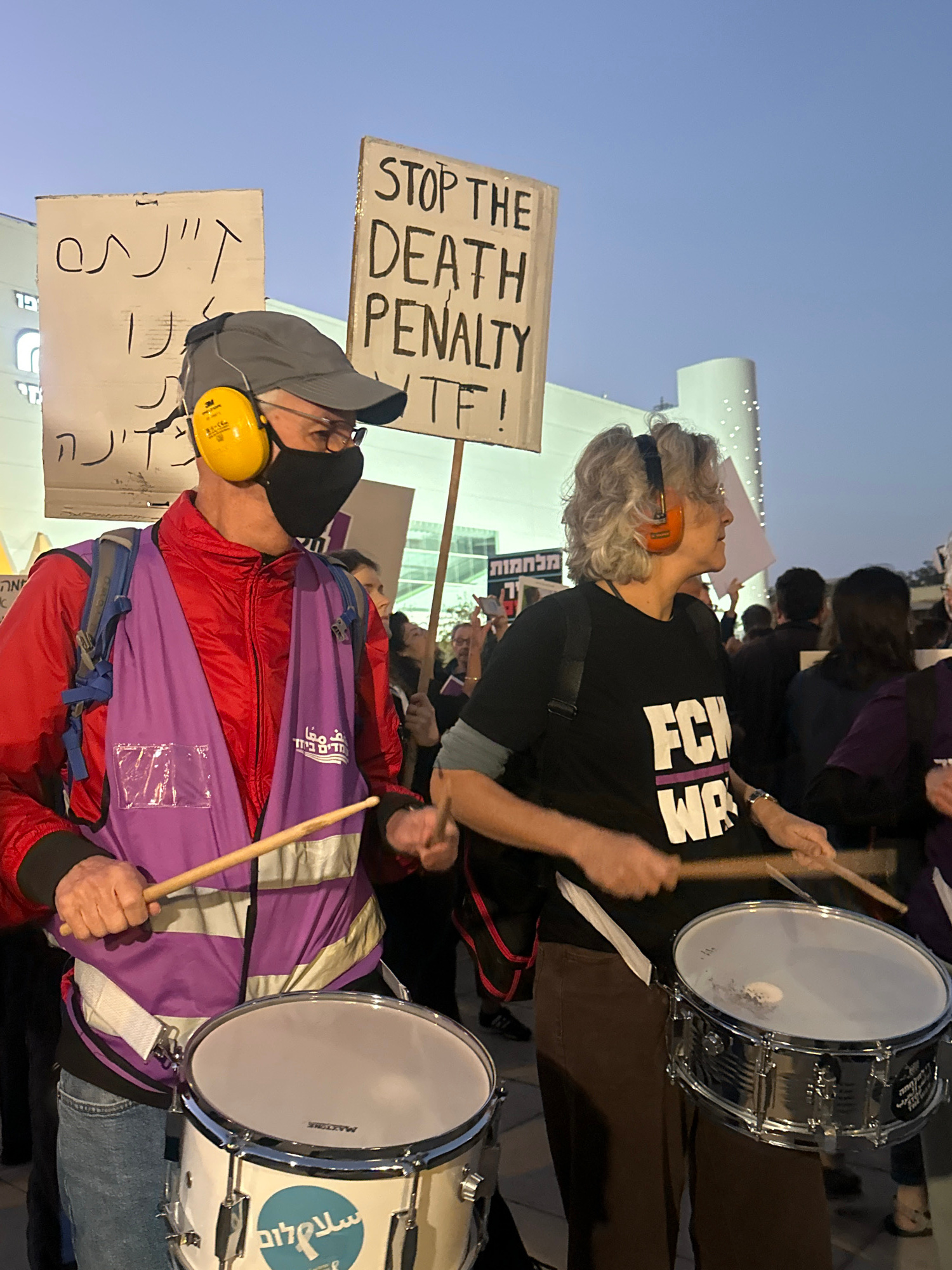 The image shows a group of people protesting. Two individuals in the foreground are holding signs and playing drums. The sign on the left reads "STOP THE DEATH PENALTY TF!" and has text in Hebrew belo…read more