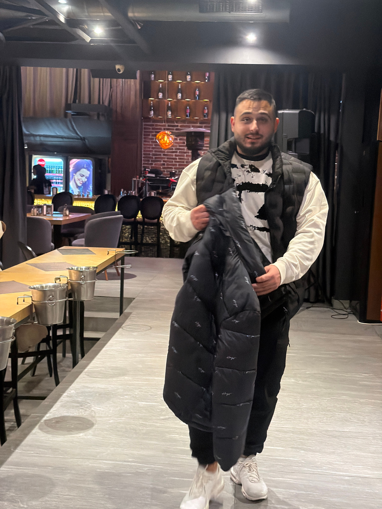 A person wearing a white long-sleeved shirt, a black vest, and black pants is standing indoors on a light gray tile floor. The person is holding a black padded jacket with a repeating small logo desigβ¦read more