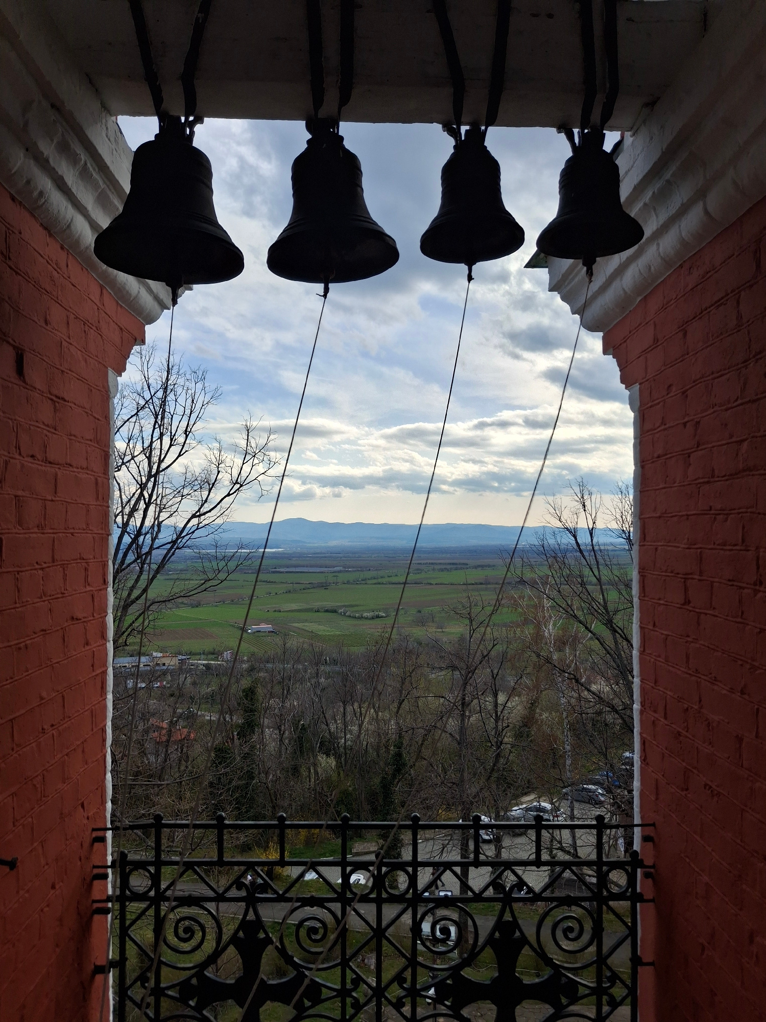 The image presents a view from a structure, presumably a bell tower, in Shipka, Bulgaria, looking out over the surrounding landscape. In the foreground, four large bells hang suspended on the left sid…read more