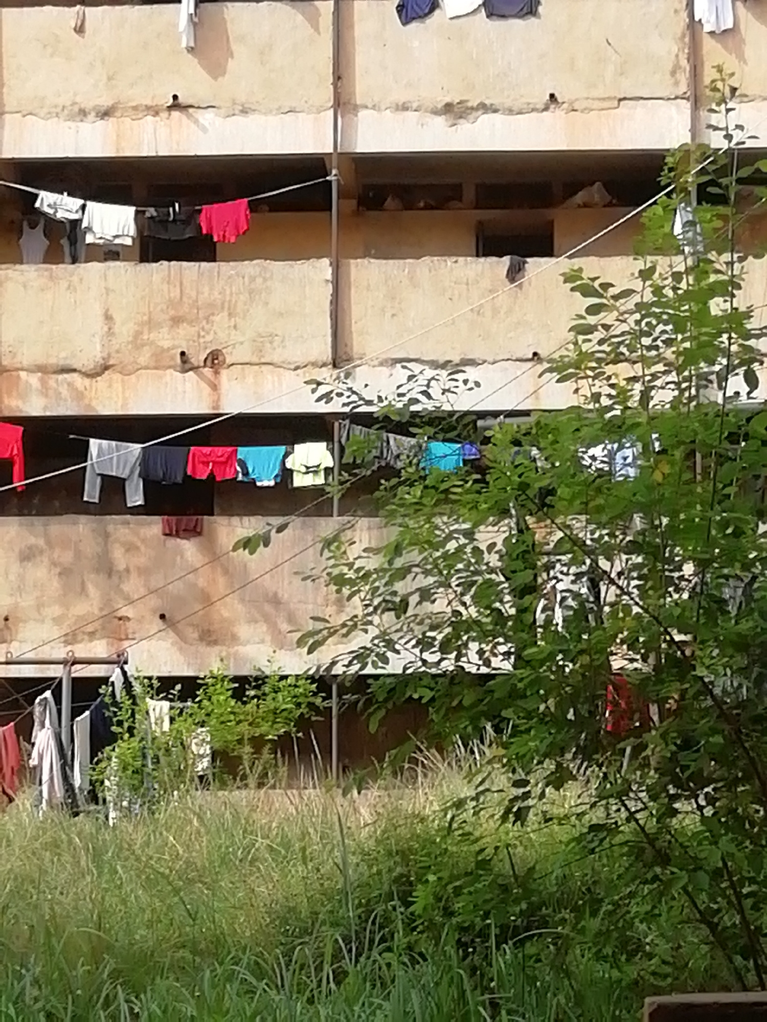 The image shows a weathered, three-story building, likely an apartment complex, in Enugu, Nigeria. Laundry lines are strung across the front, laden with colorful clothing. Overgrown vegetation, includ…read more
