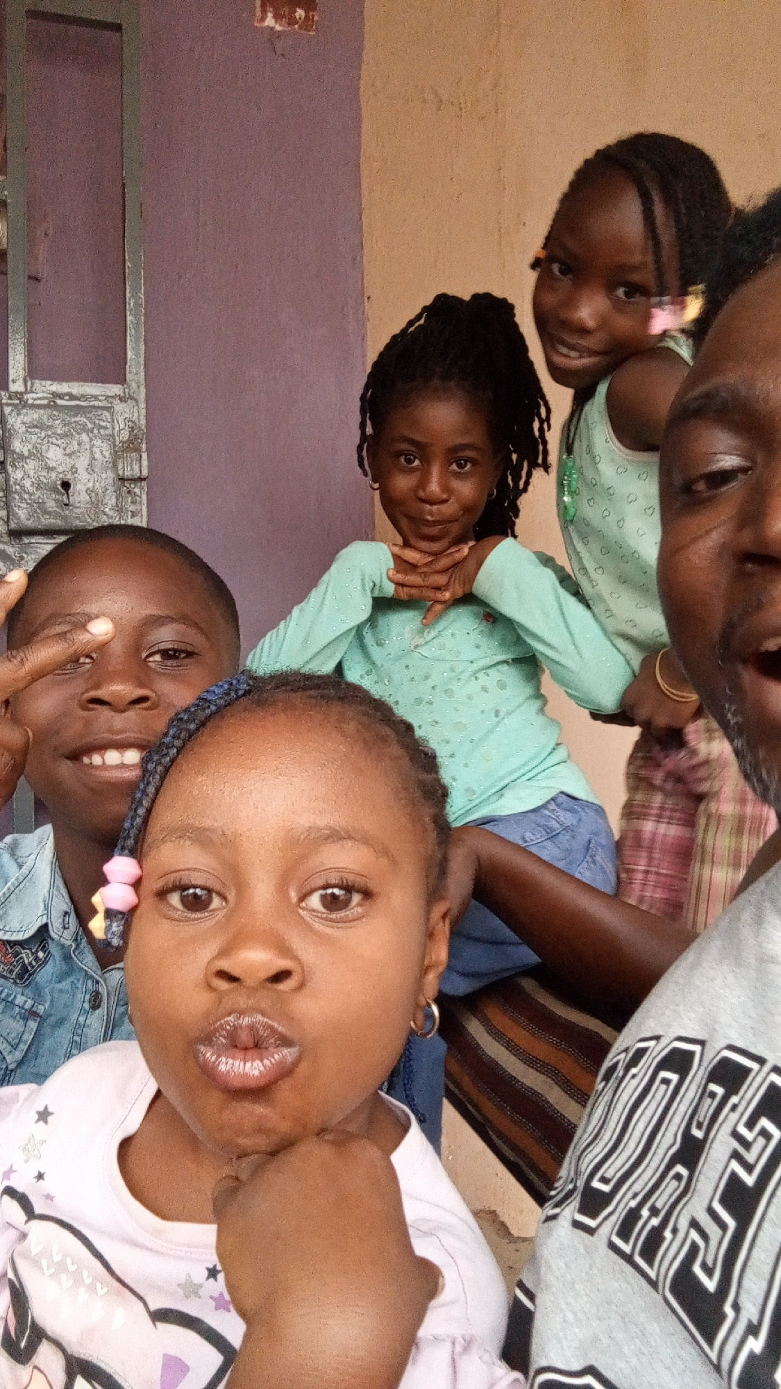 A group of five people, likely a family or friends, are captured in a selfie-style photograph taken outdoors. Foreground: A young girl with braided hair decorated with a pink and white flower holds h…read more