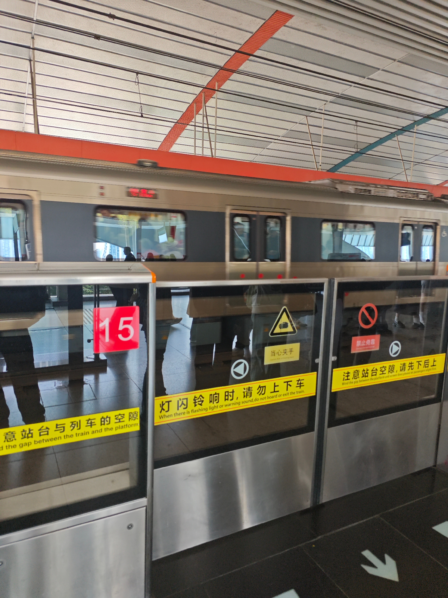 The image depicts a train station platform in Chongqing High-tech Zone, China. A train is visible behind a glass safety barrier. The barrier has signs in Chinese and English warning about the gap betw…read more