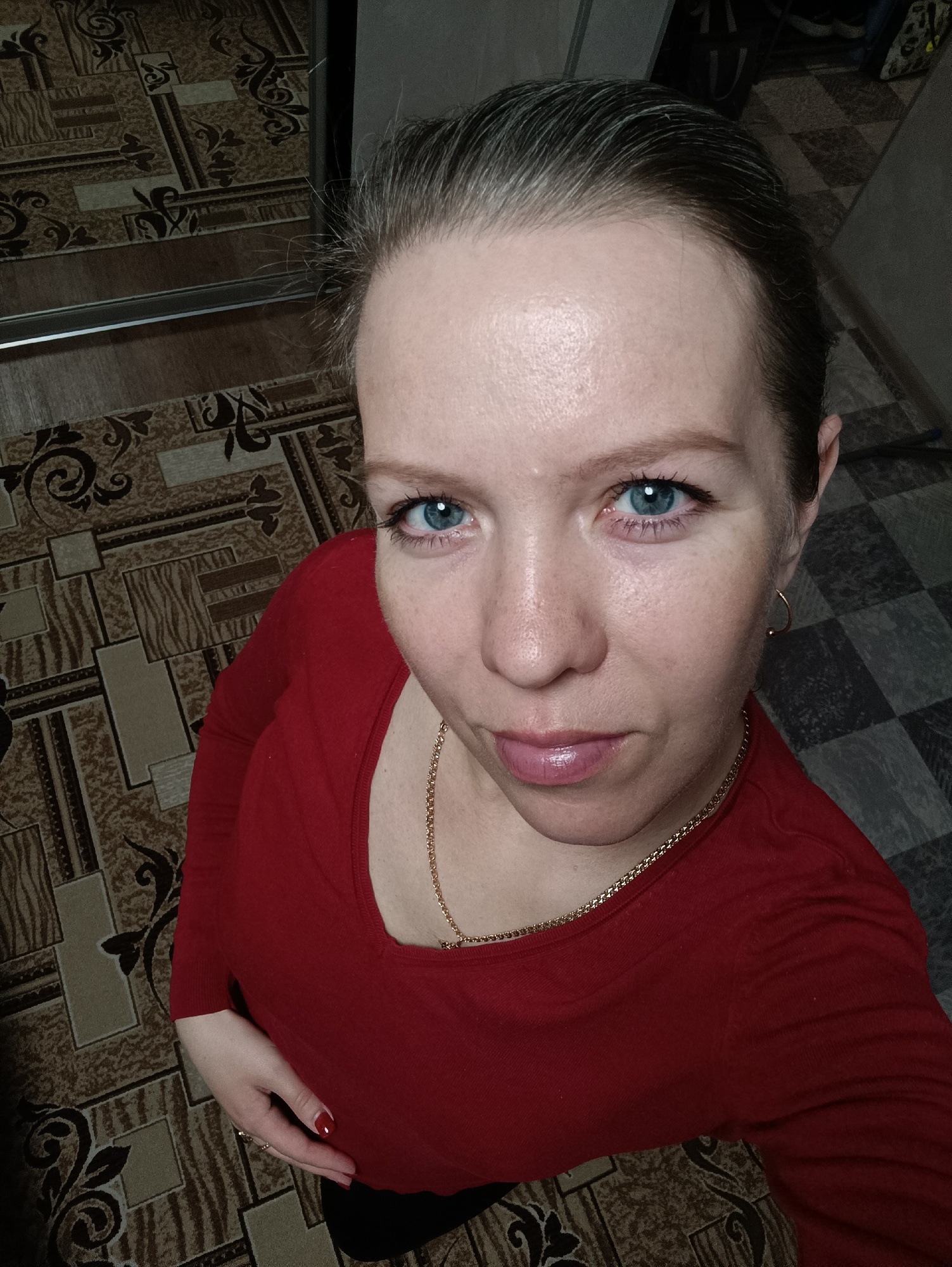 A high-angle, close-up indoor selfie features a woman looking directly towards the camera. She has light skin, bright blue eyes, and dark hair pulled back, revealing some grey strands. Her lips are a…read more
