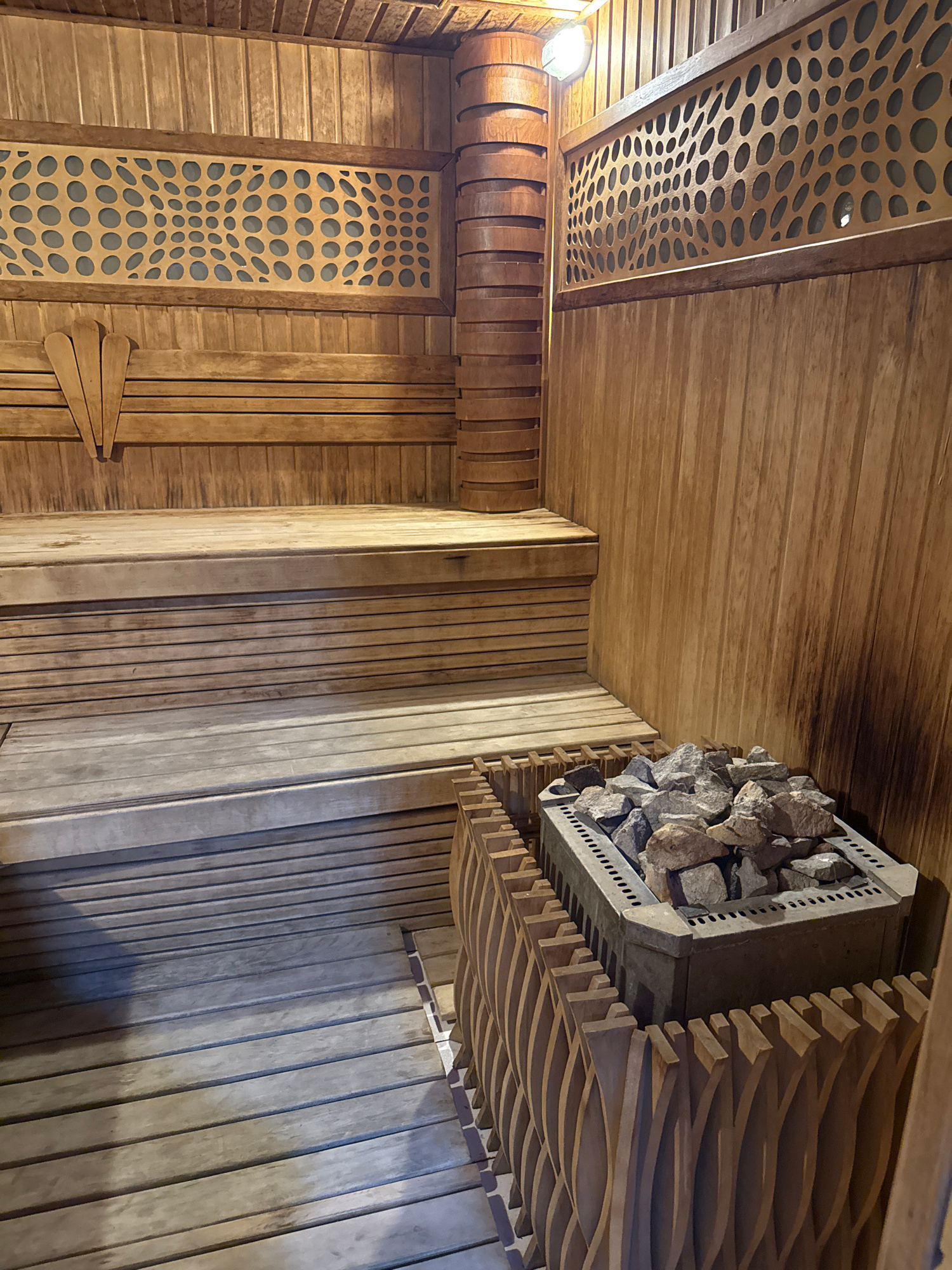 A sauna room interior. The walls, ceiling, and other structures within the room are made of wood. The wood grain and texture are prominent throughout the space. On one side, there's a structure holdin…read more