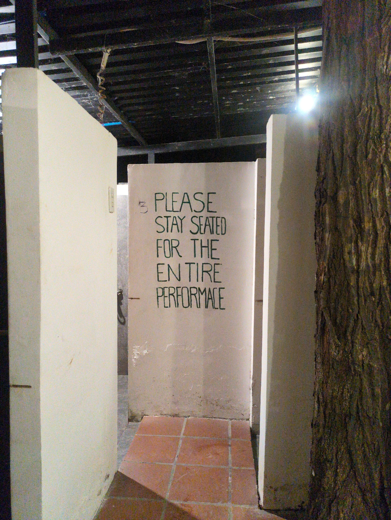 The image shows an indoor seating area with the message "PLEASE STAY SEATED FOR THE ENTIRE PERFORMANCE" displayed on a sign. The location is likely in Phú Quốc, Vietnam. The ceiling appears to be made…read more