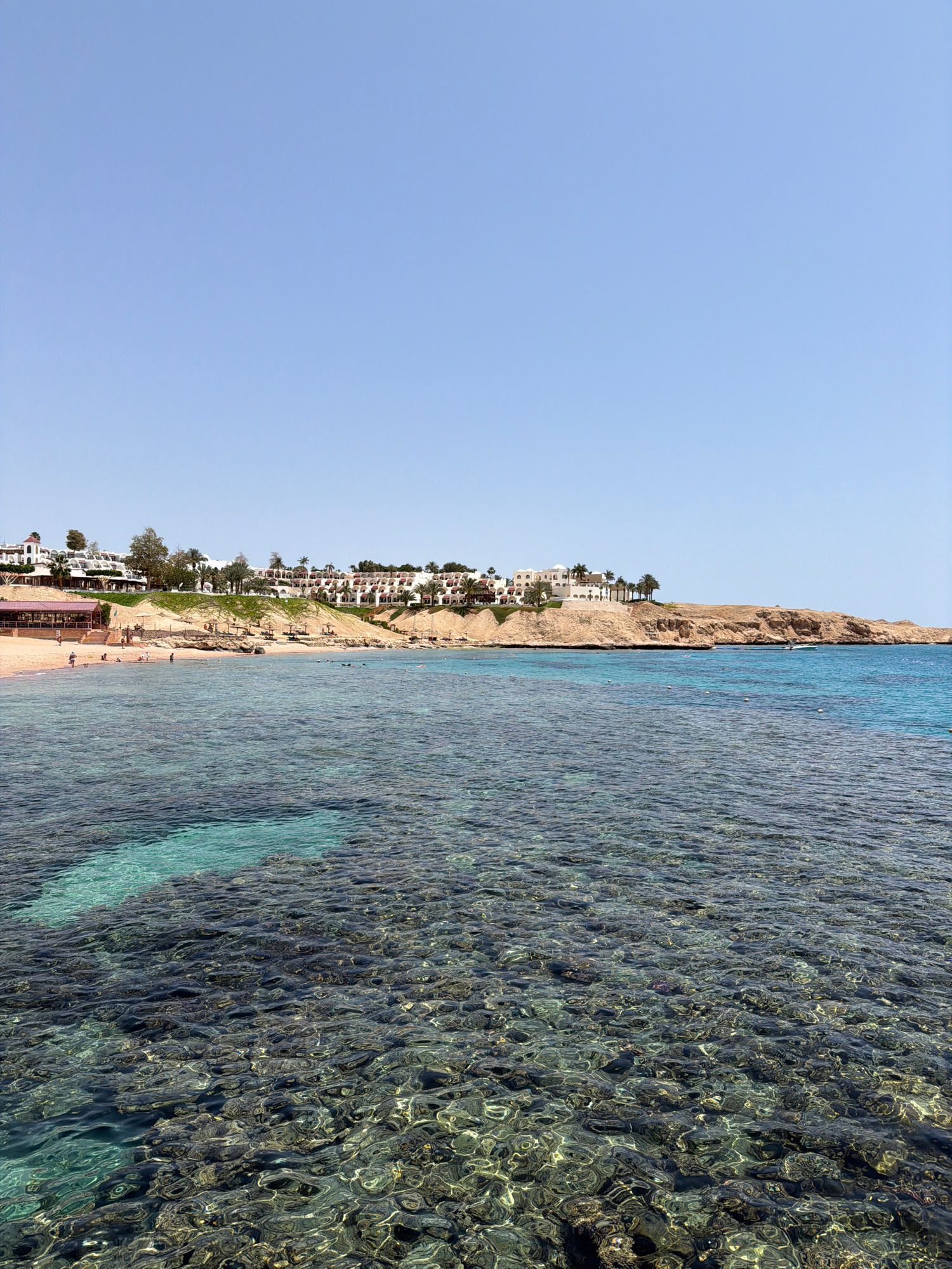 The image shows a coastline in Sharm El Sheikh, Egypt. The left half of the image is predominantly sky blue. The right half consists of clear, shallow water revealing the rocky seabed, transitioning t…read more
