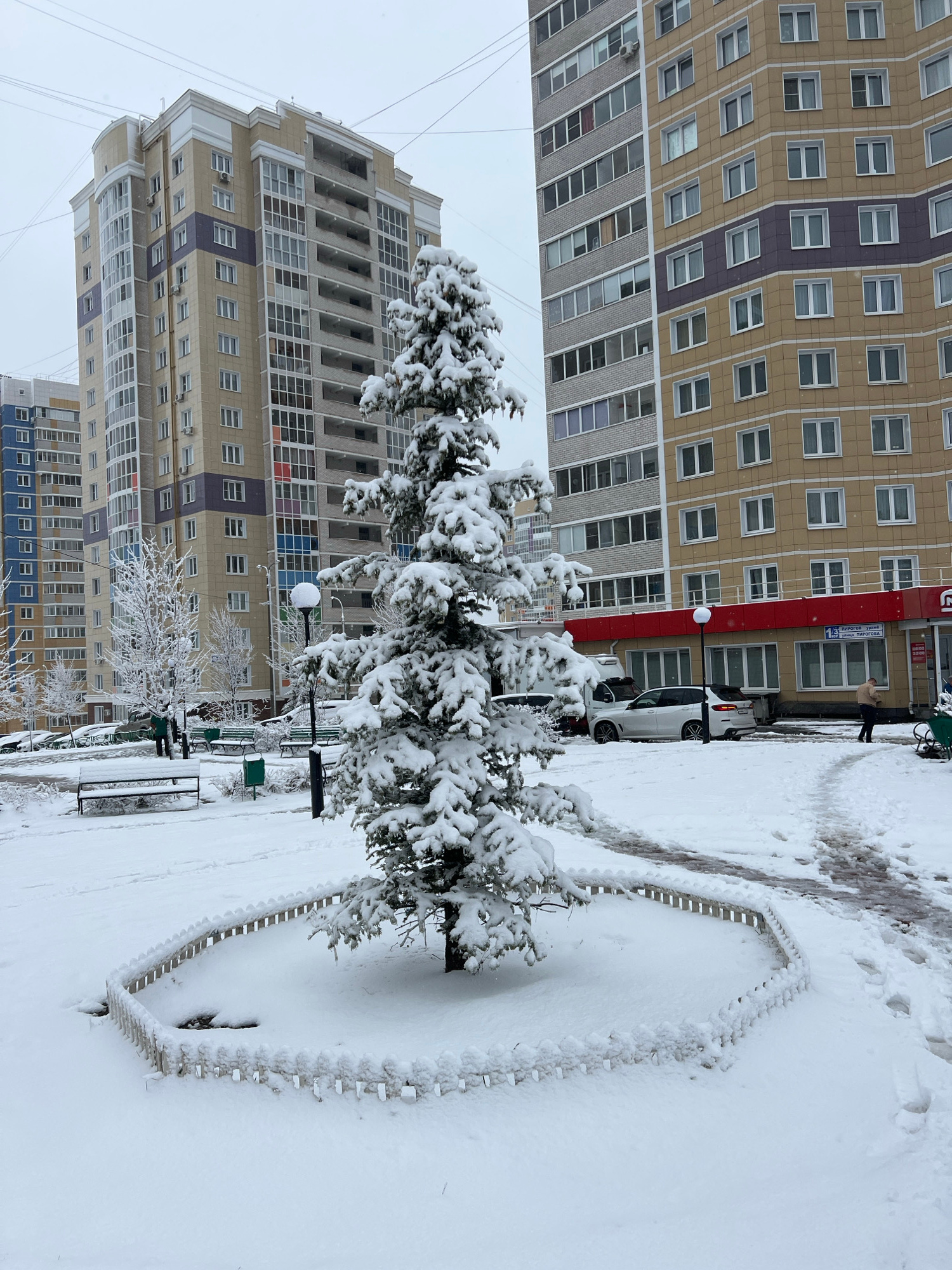 The image portrays a serene, snow-covered urban landscape in Cheboksary, Russia, during winter. Dominating the scene are several tall, modern multi-story residential buildings, characterized by their…read more