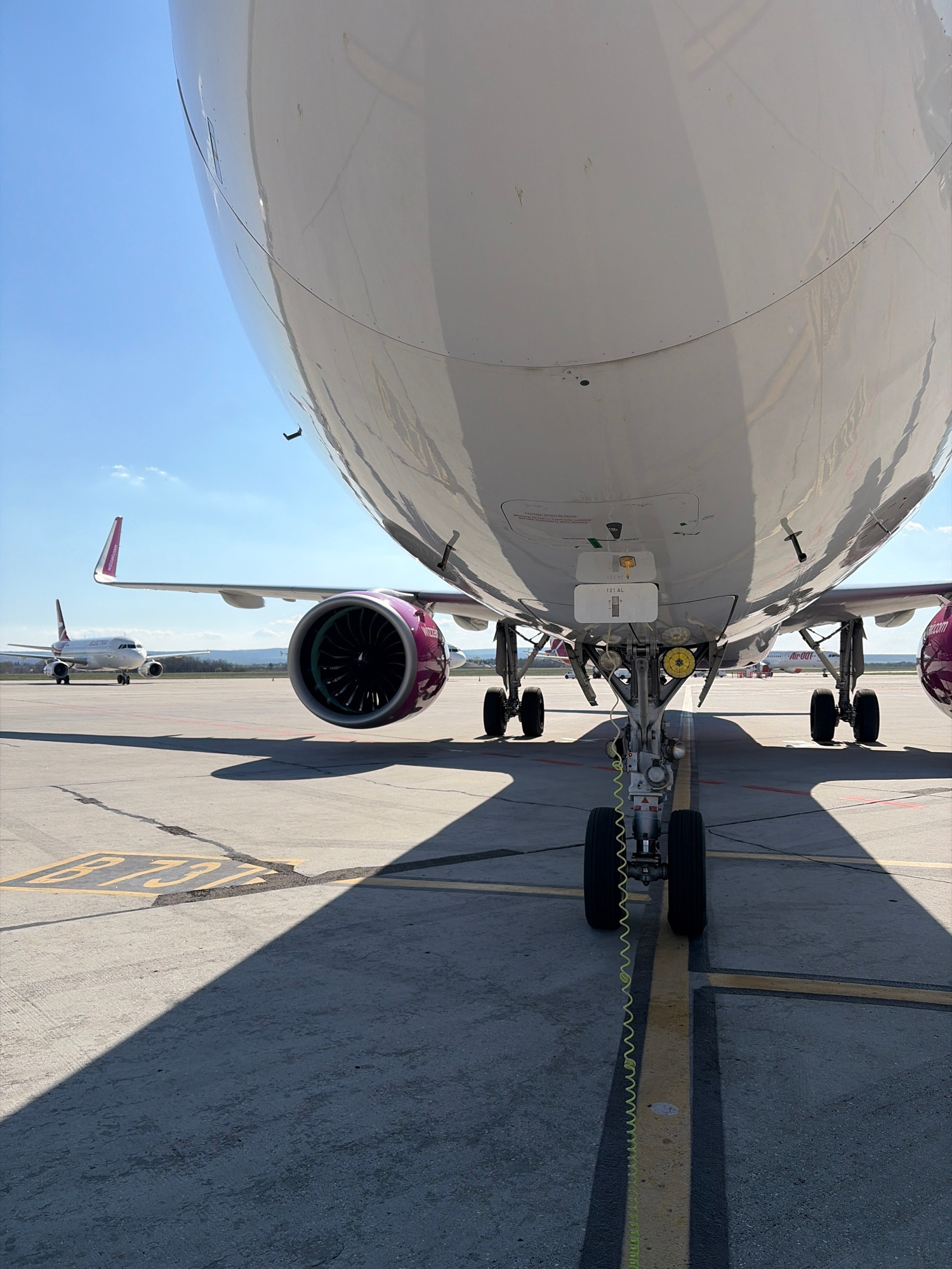 The image depicts the undercarriage and fuselage of a Wizz Air Airbus A321 aircraft parked on an asphalt apron. The aircraft's nose landing gear is visible, with a coiled yellow cable extending from iā¦read more