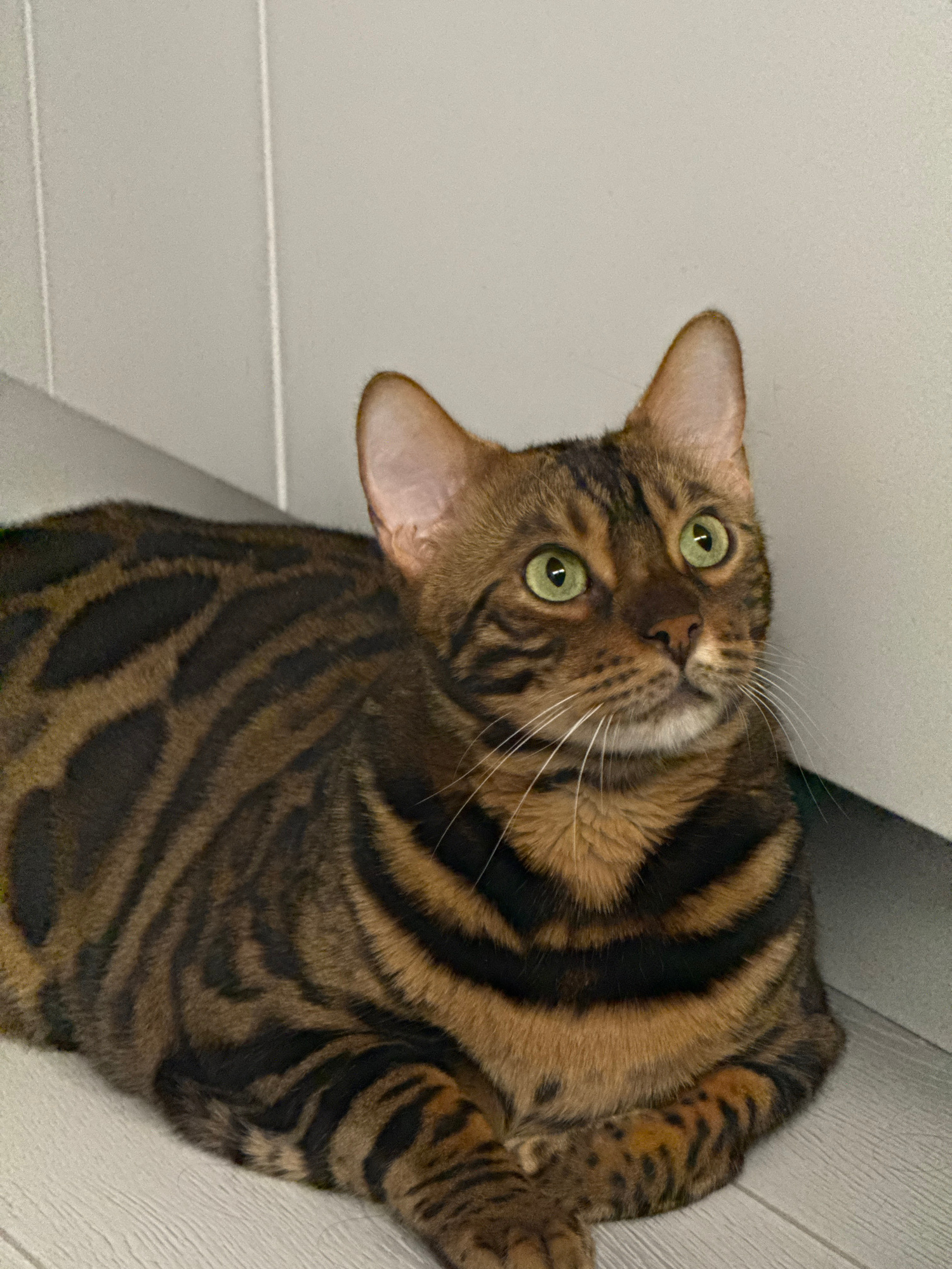 A Bengal cat is positioned near a white, paneled wall. The cat's striped fur pattern is visible, as are its green eyes and light-colored ears. The photograph is taken from a low angle, looking up at t…read more