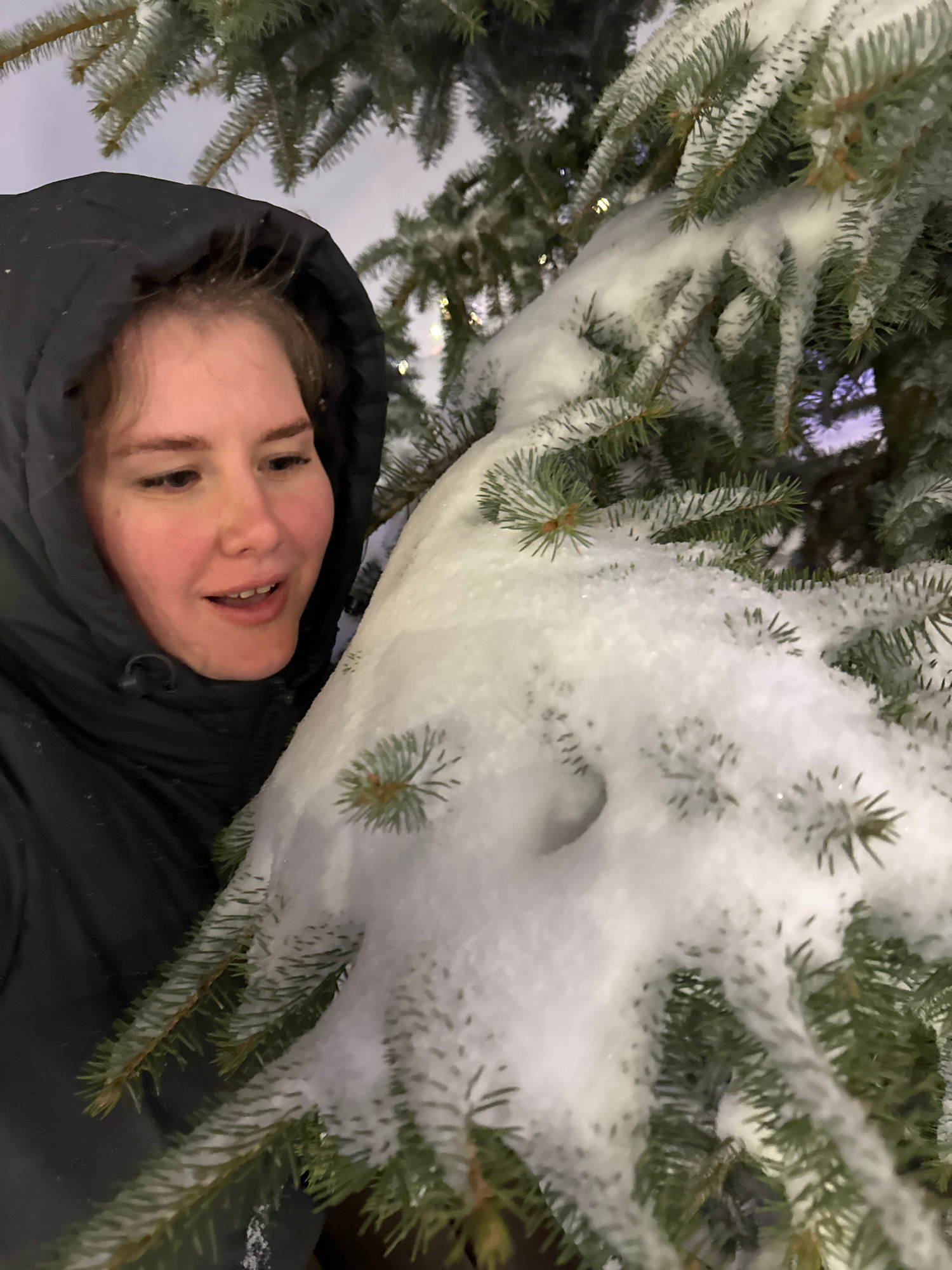 A woman wearing a black hooded jacket is pictured from a low angle, positioned under a snow-covered coniferous tree. The branches of the tree, laden with snow, surround her head and torso. The woman i…read more