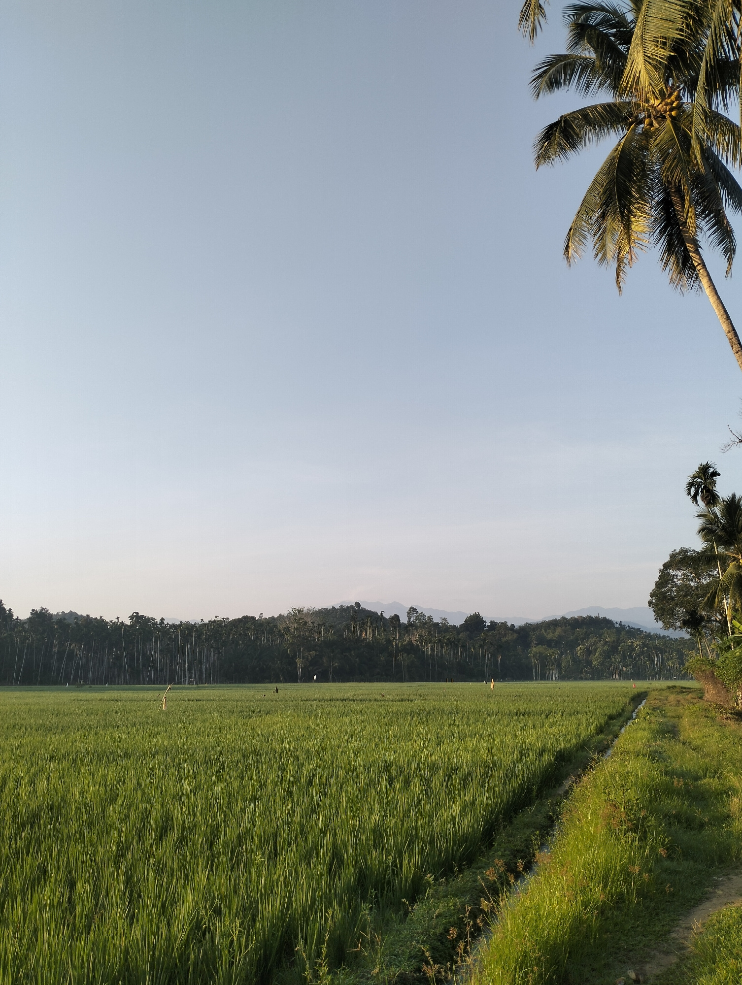 The image displays an expansive agricultural landscape located in Meunasahalue, Indonesia. The upper third of the frame shows a clear, light blue sky. The foreground and mid-ground consist of a large,…read more