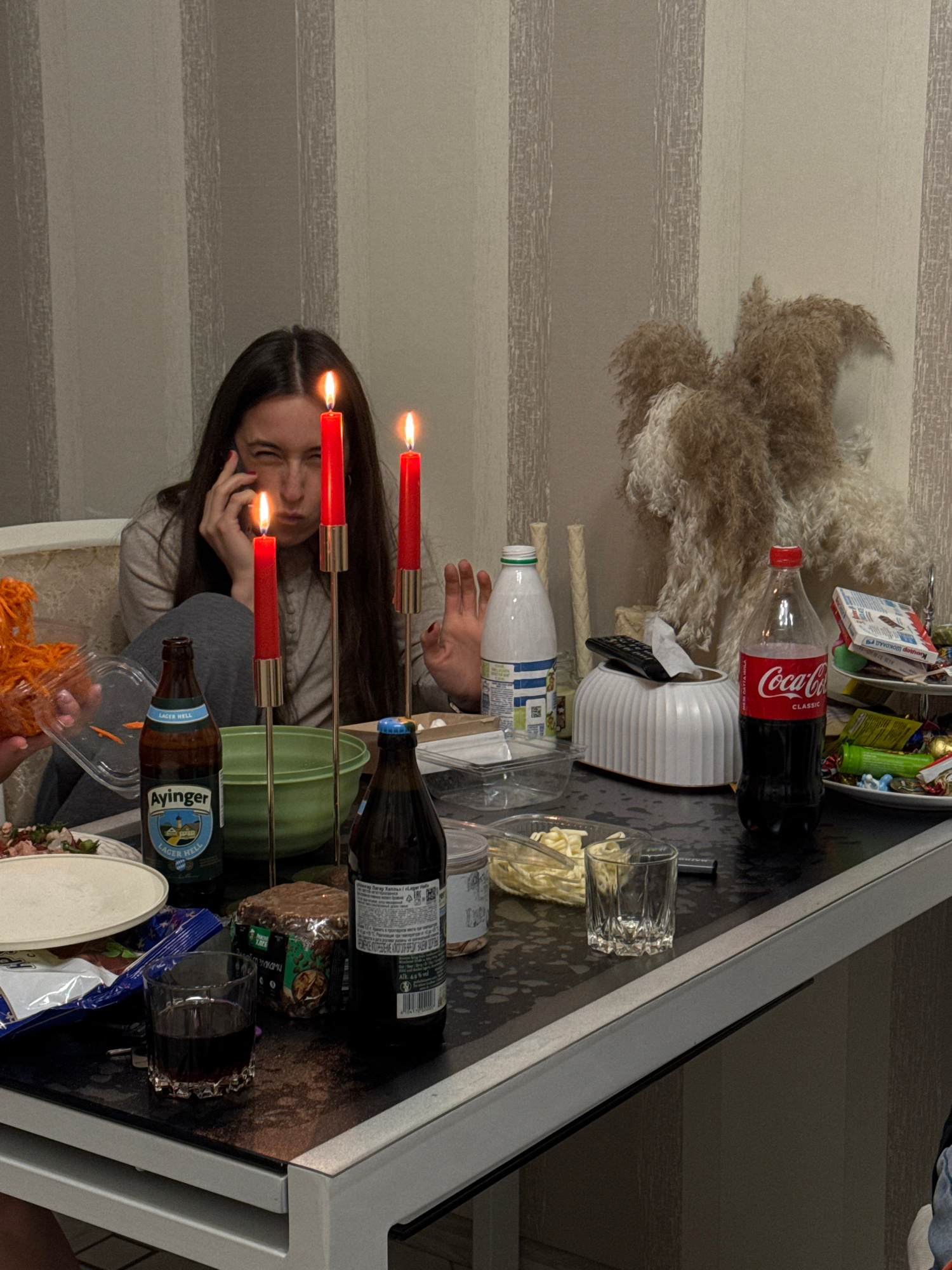 The image depicts a person sitting next to a table that is heavily laden with a variety of items. The person appears to be resting their head on their hand, and has a candle decoration on top of their…read more