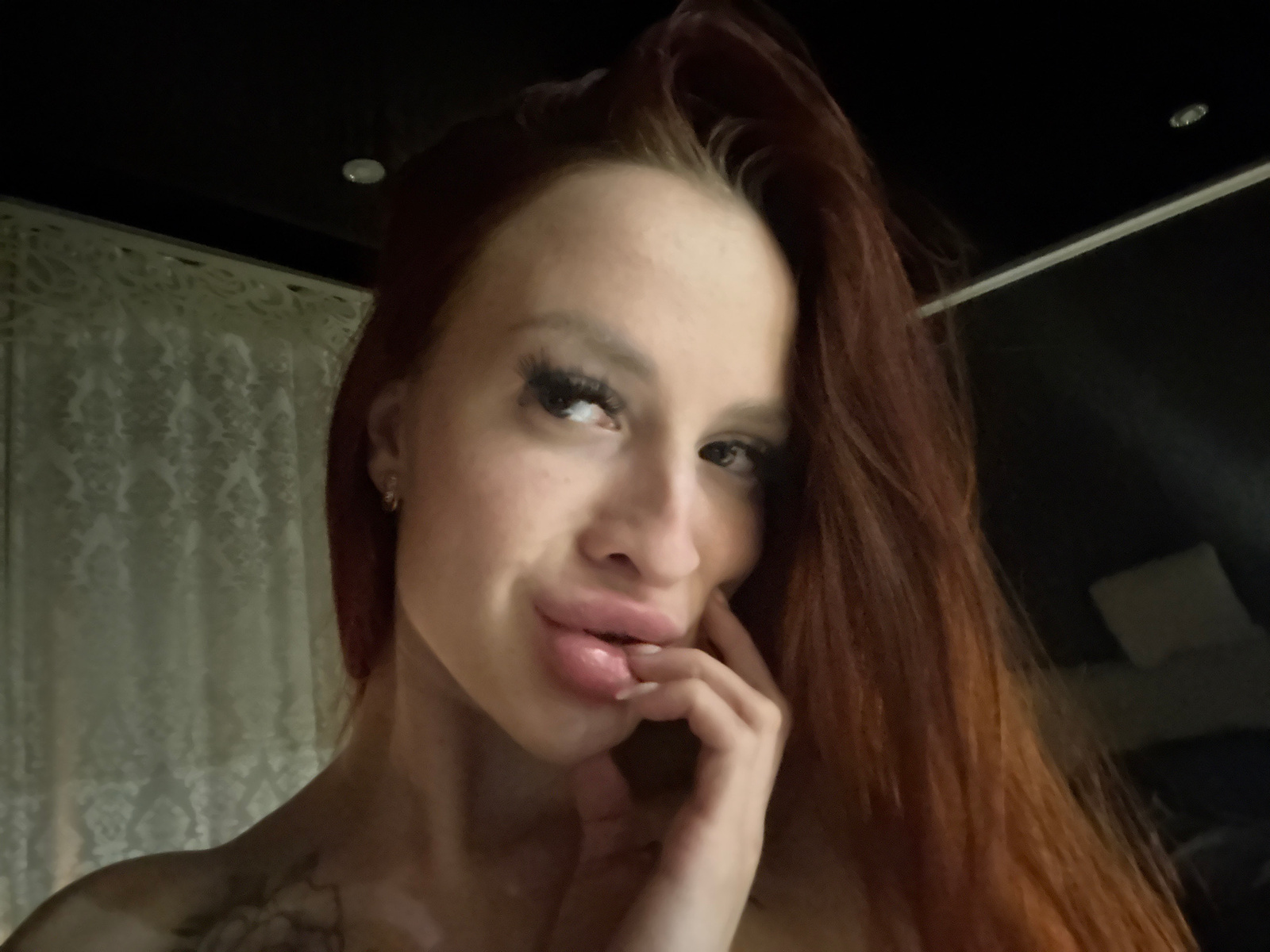 A woman with red hair is posing indoors. She has light skin and dark eyelashes. Her fingers are near her lips. In the background, there is a couch and a window covered with lace curtains. There is no…read more