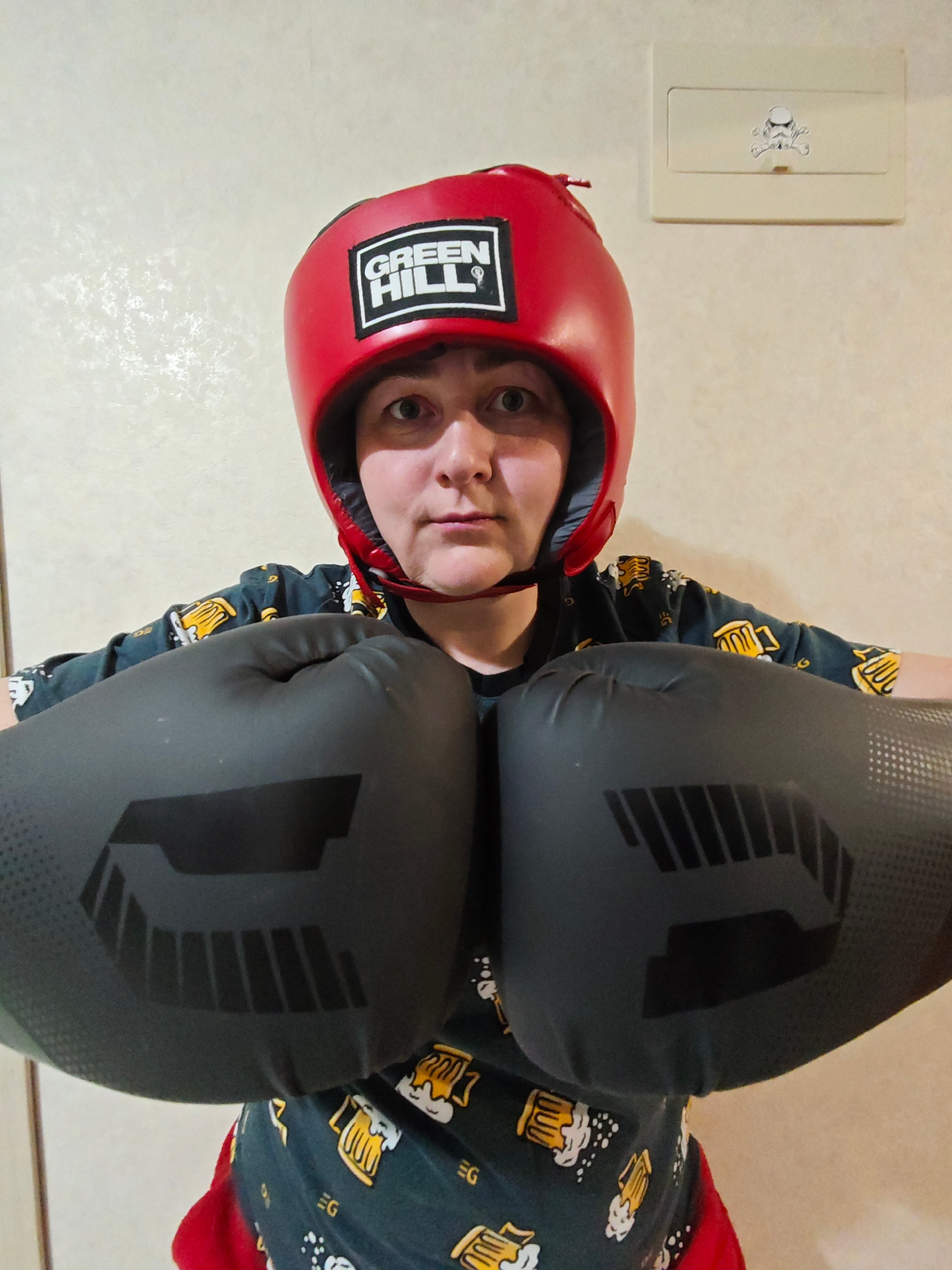 A person is centered in the image, wearing a red Green Hill boxing headgear and large black boxing gloves, positioned as if ready to box. They are wearing a dark green shirt with a pattern of beer mug…read more