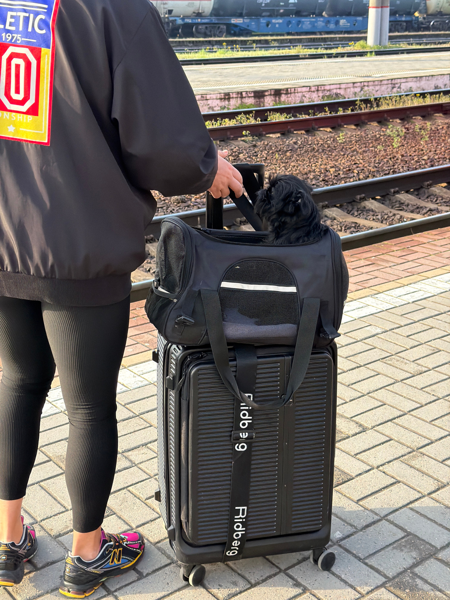 A person stands on a brick-paved surface next to a train track. The person is wearing black leggings, black athletic shoes with colorful accents, and a black jacket with a colorful patch on the sleeve…read more