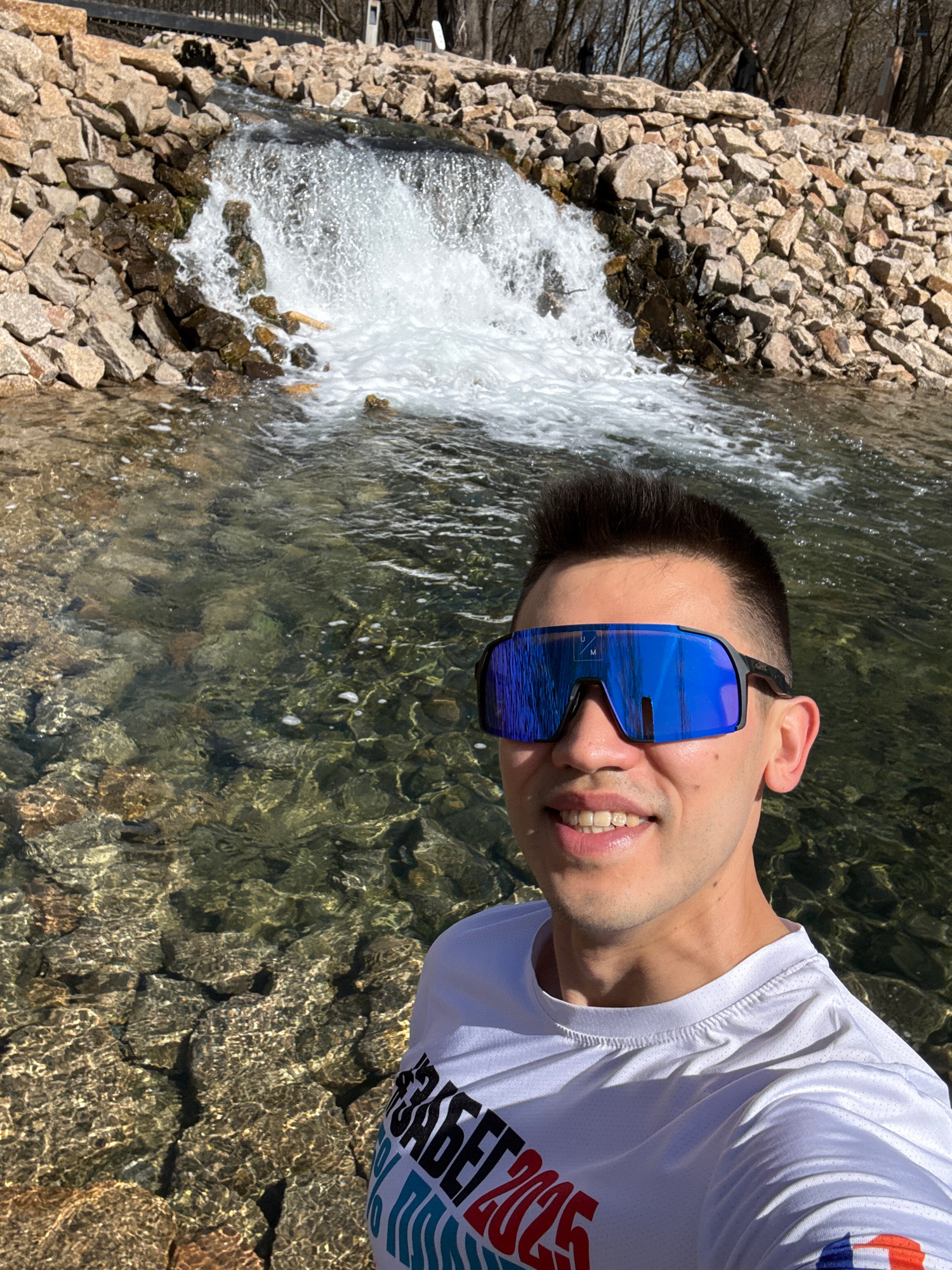 A man in a white shirt and blue sunglasses stands near a waterfall, possibly for a selfie or photo. The water cascades over light-colored rocks. The water reflects the sunlight and the rocks below. Tr…read more