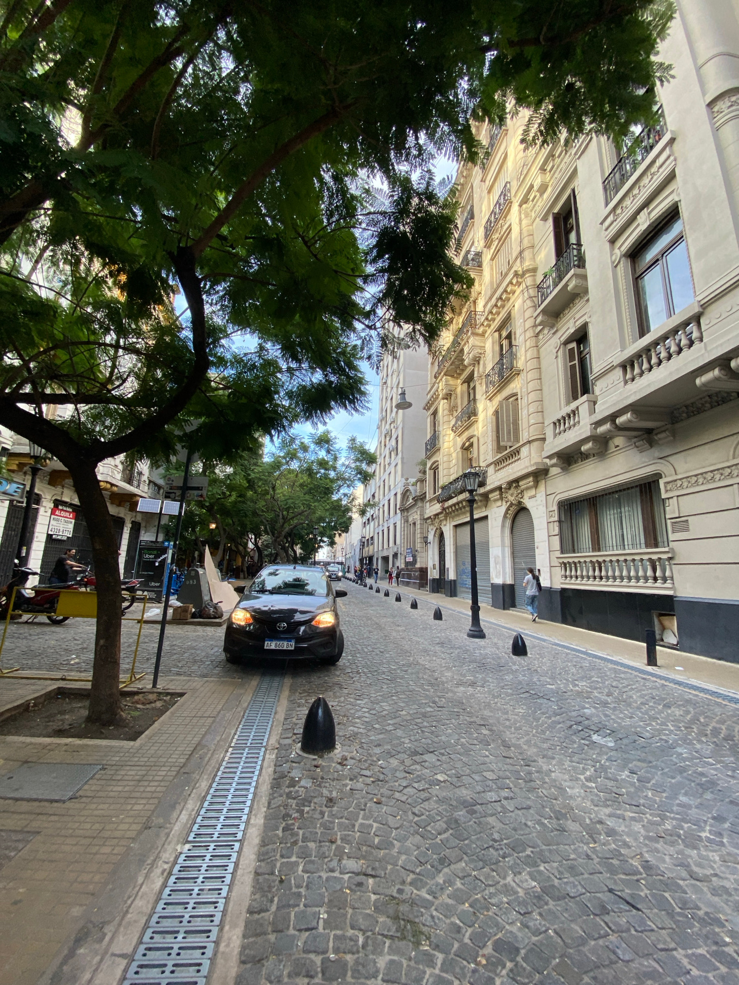 The image shows a street scene in Buenos Aires, Argentina. The camera is pointed down a street paved with cobblestones, lined with ornate, multi-story buildings on one side and a tree-lined sidewalk o…read more
