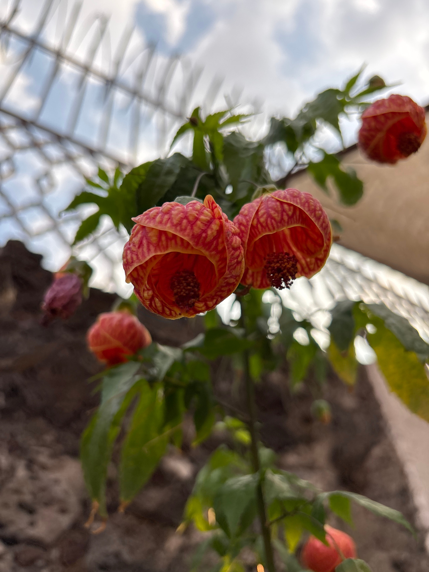 The image shows a close-up view of several Abutilon pictum flowers, commonly known as flowering maple or painted abutilon. The flowers are bell-shaped with orange-red petals marked with darker red vei…read more