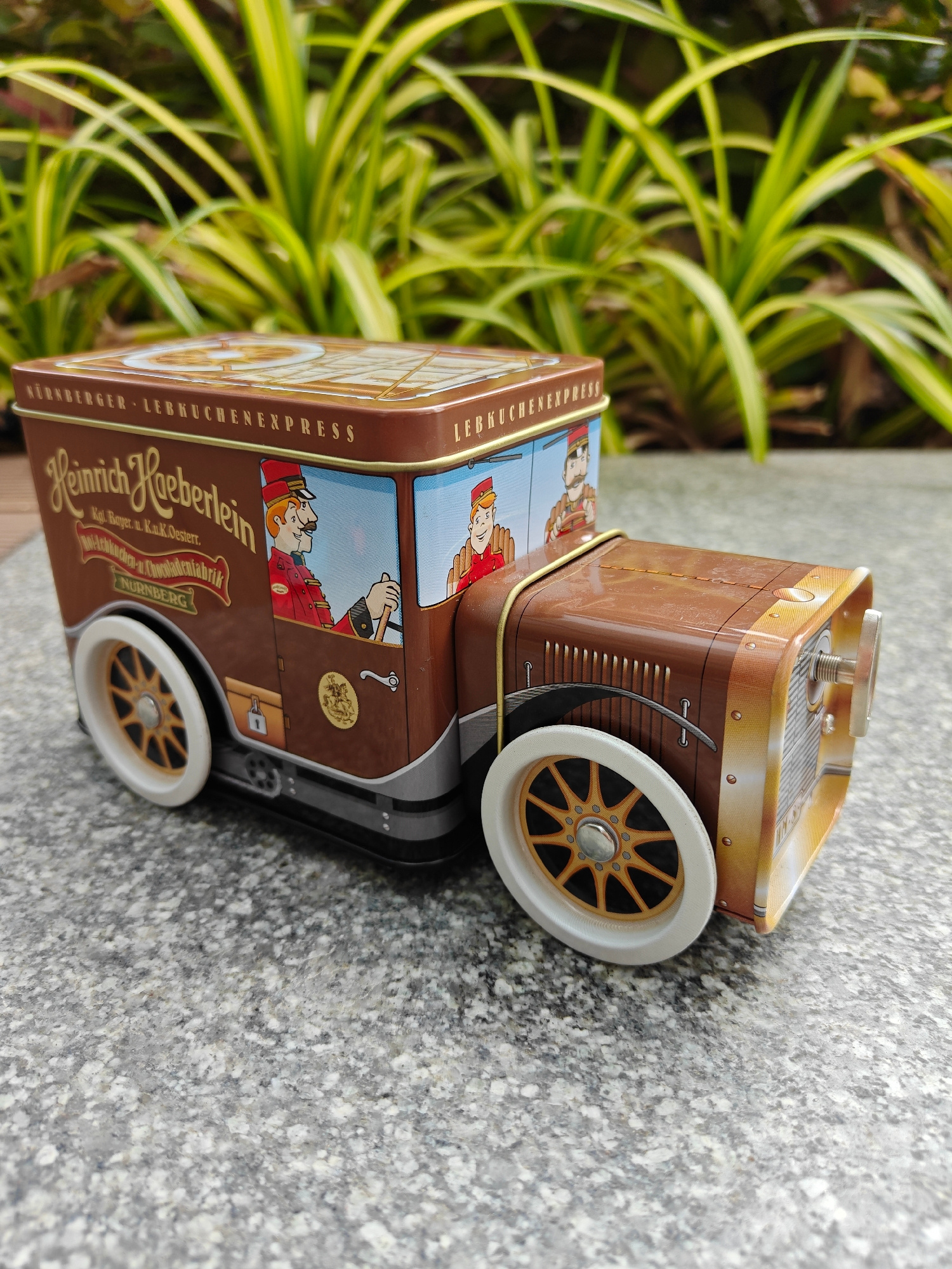 The image shows a tin box designed to resemble an antique truck. The box is brown and beige, with graphics of men in old-fashioned uniforms on the sides. The words "NÜRNBERGER LEBKUCHENEXPRESS" and "H…read more