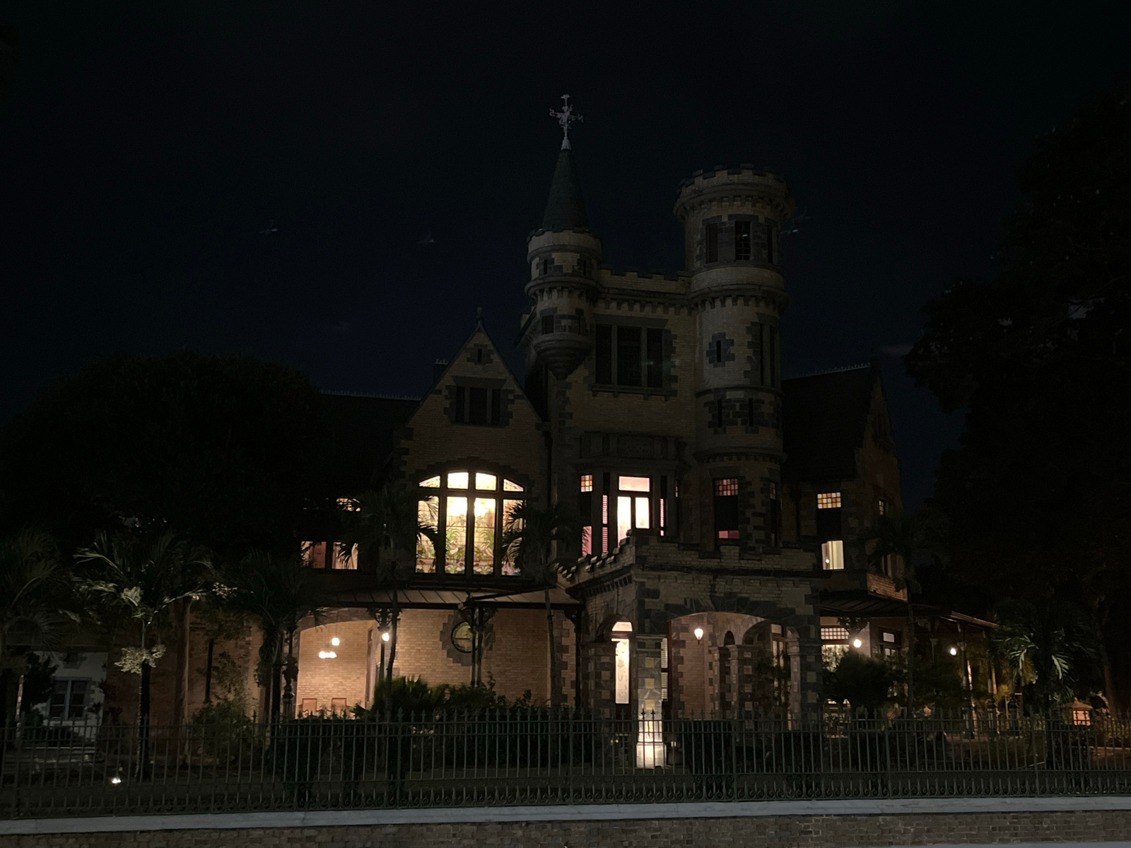 A nighttime photograph shows Mille Fleurs, one of the Magnificent Seven buildings located in Port of Spain, Trinidad and Tobago. The image is captured from across the street, with the wrought-iron fenβ¦read more