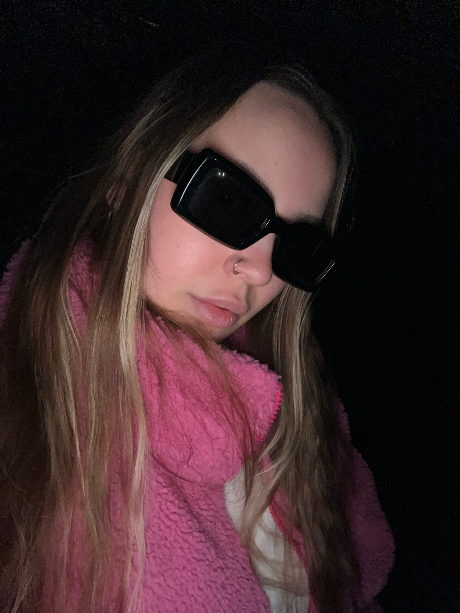A young woman wearing black sunglasses and a nose ring lies down, partially obscured by a pink fuzzy jacket. The background is dark, suggesting a poorly lit indoor setting.