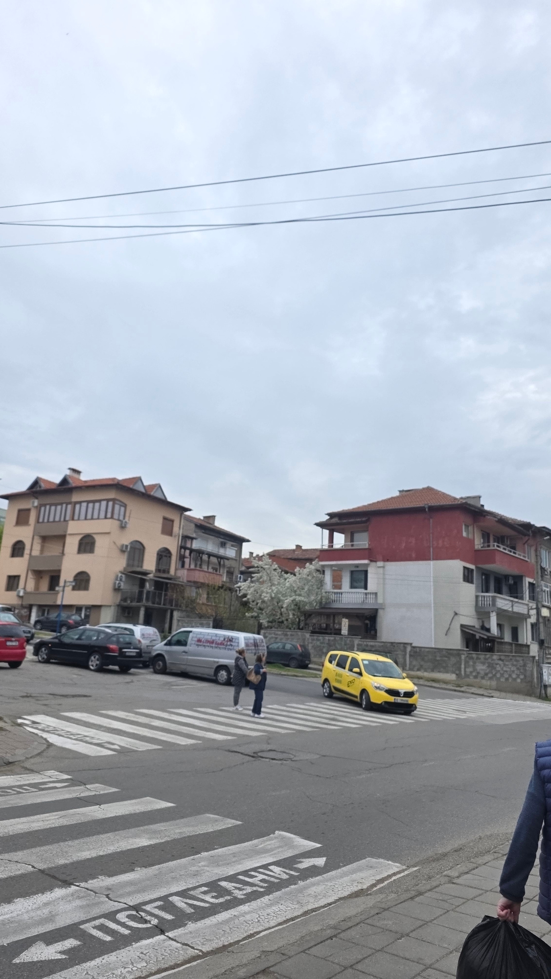 The image depicts a street scene in Blagoevgrad, Bulgaria. The view is oriented along a crosswalk with pedestrian markings written in Bulgarian. A person is crossing the street. Various vehicles, incl…read more
