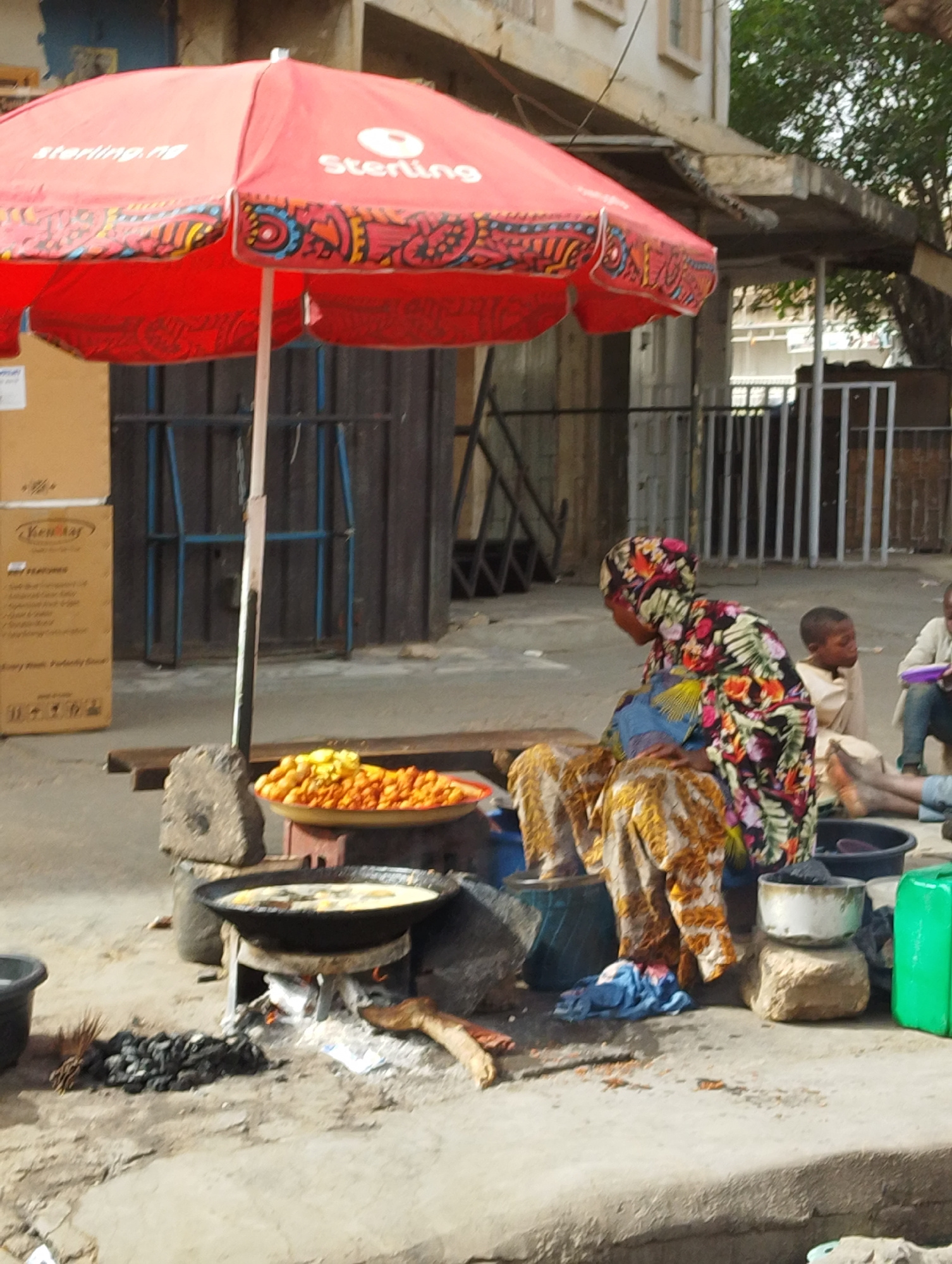 A street scene in Fagge A, Nigeria shows a woman in a floral headscarf and dress seated beside a makeshift cooking station. A red Sterling-branded umbrella shades her. She appears to be cooking or fry…read more