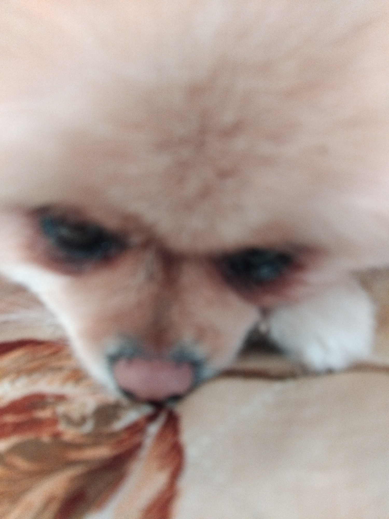 The media file is an extremely blurry, close-up photograph of a light-colored, fluffy animal, most likely a dog or cat, resting indoors. The animal's fur appears to be white or a very light cream/tan.…read more